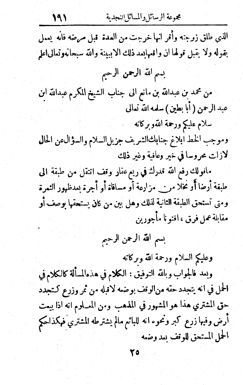 من محمد بن عبد الله بن مانع إلى جناب الشيخ المكرم عبد الله بن عبد الرحمن (أبا بطين) سلمه الله تعالى.