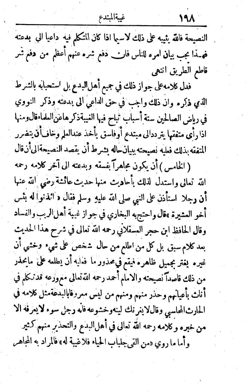 وقال الحافظ ابن حجر العسقلاني -رحمه الله تعالى- في شرح هذا الحديث بعد كلام سبق: بل كل من اطلع من حال شخص على شيء، وخشي أن غيره يغتر بجميل ظاهره؛ فيقع في محذور ما، فعليه أن يطلعه على ما يحذر من ذلك قاصدا نصيحته. والإمام أحمد -رحمه الله تعالى- مع ورعه -قد تكلم في أناس بأعيانهم، وحذر منهم، ومنهم من ليس معروفا بالبدعة، مثل: كلامه في الحارث المحاسبي، وقال: لا يغُرَّنك لينه، وخشوعه؛ فإنه رجل سوء، لا يعرفه إلا من خَبَرَه. وكلامه -رحمه الله تعالى- في أهل البدع، والتحذير منهم كثير.
