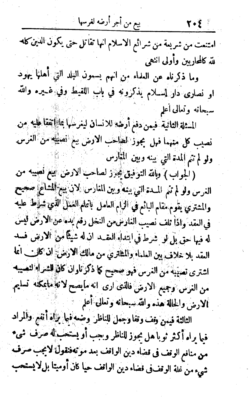 (الجواب) وبالله التوفيق: يجوز لصاحب الأرض بيع نصيبه من الغرس، ولو لم تتم المدة التي بينه وبين المغارس؛ لأن بيع المشاع صحيح، والمشتري يقوم مقام البائع في إلزام العامل بإتمام العمل الذي شرط عليه في العقد. وإذا تلف نصيب الغارس من النخل، رفع يده عن الأرض، ليس له فيها حق، بل لو شرط في ابتداء العقد أن له شيئا من الأرض فسد العقد بلا خلاف بين العلماء. والمشتري من مالك الأرض إن كان إنما اشترى نصيبه من الغرس فهو صحيح كما ذكرنا، وإن كان الشراء لنصيبه من الغرس وجميع الأرض فالذي أرى أنه ما يصح، لأنه ما يمكنه تسليم الأرض، والحالة هذه، والله -سبحانه وتعالى- أعلم.