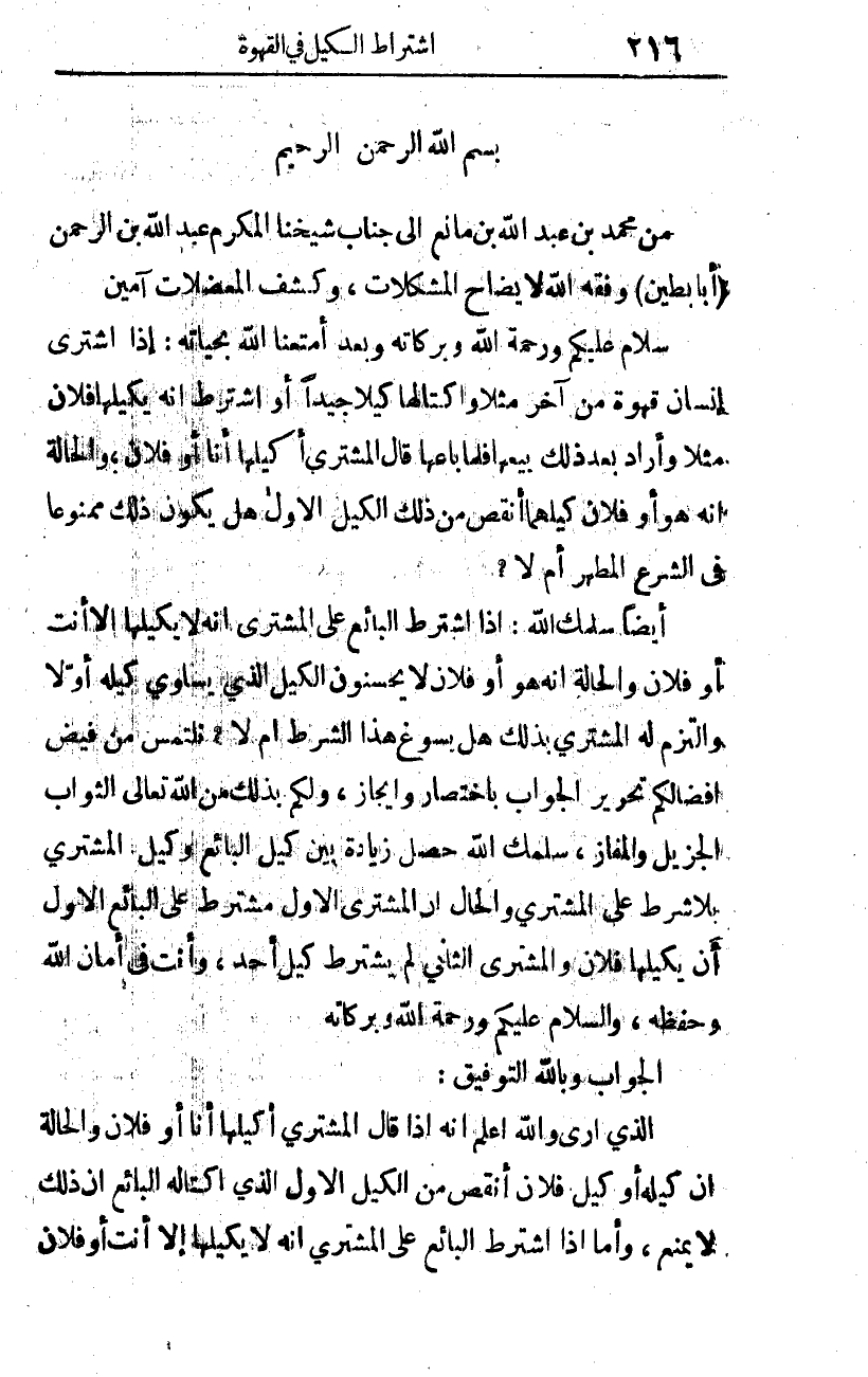 (وبعد): أمتعنا الله بحياته، إذا اشترى إنسان قهوة من آخر مثلا، واكتالها كيلا جيدا، أو اشترط أنه يكيلها فلان مثلا، وأراد بعد ذلك بيعها، فلما باعها قال المشتري: أكيلها أنا أو فلان، والحالة أنه هو أو فلان كيلهما أنقص من ذلك الكيل الأول، هل يكون ذلك ممنوعا في الشرع المطهر، أم لا؟