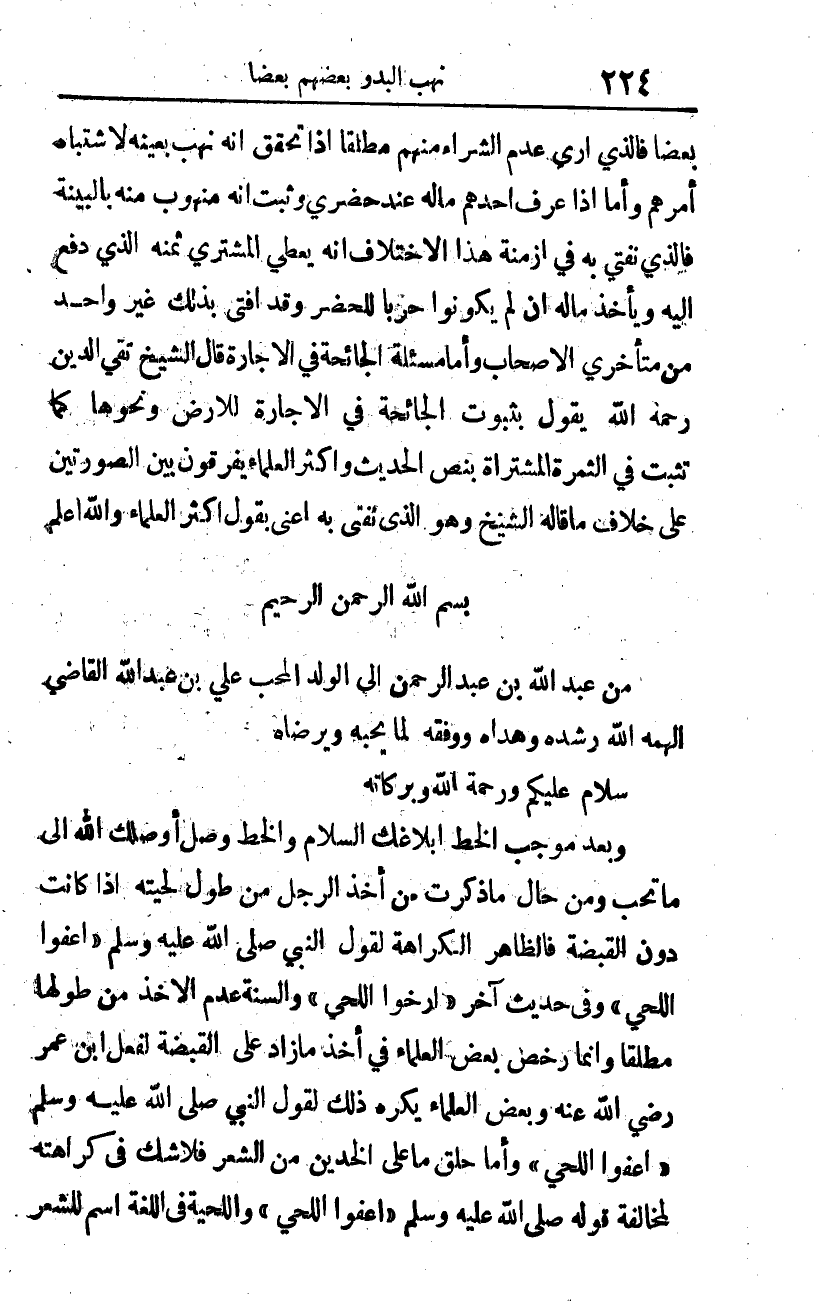 (وبعد): موجب الخط إبلاغك السلام، والخط وصل، أوصلك الله إلى ما تحب. ومن حال ما ذكرت من أخذ الرجل من طول لحيته، إذا كانت دون القبضة، فالظاهر الكراهة، لقول النبي صلى الله عليه وسلم: "اعفوا اللٍّحَى" وفي حديث آخر: "أرخوا اللحى". والسنة عدم الأخذ من طولها مطلقا، وإنما رخص بعض العلماء في أخذ ما زاد على القبضة لفعل ابن عمر رضي الله عنه، وبعض العلماء يكره ذلك لقول النبي صلى الله عليه وسلم: "أعفوا اللحى"1.