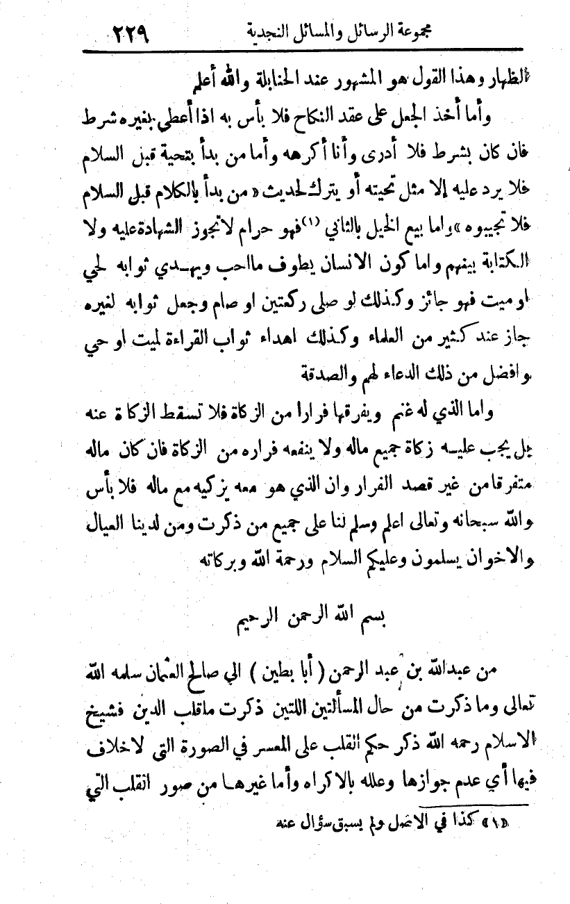 من عبد الله بن عبد الرحمن (أبا بطين) إلى صالح العثمان -سلمه الله تعالى-.