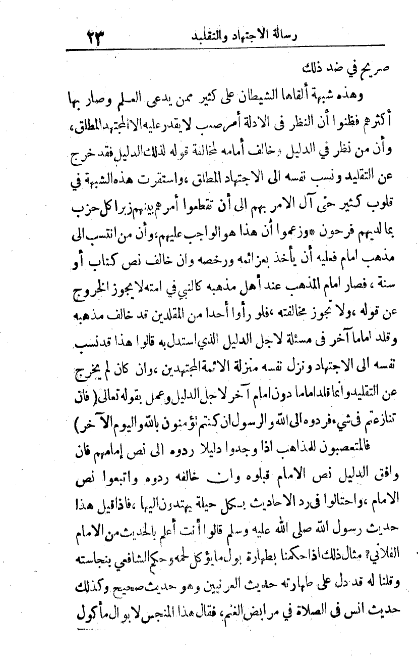 وهذه شبهة ألقاها الشيطان على كثير ممن يدعي العلم، وصار بها أكثرهم، فظنوا أن النظر في الأدلة أمر صعب لا يقدر عليه إلا المجتهد المطلق، وأن من نظر في الدليل، وخالف إمامه لمخالفة قوله لذلك الدليل فقد خرج عن التقليد، ونسب نفسه إلى الاجتهاد المطلق.