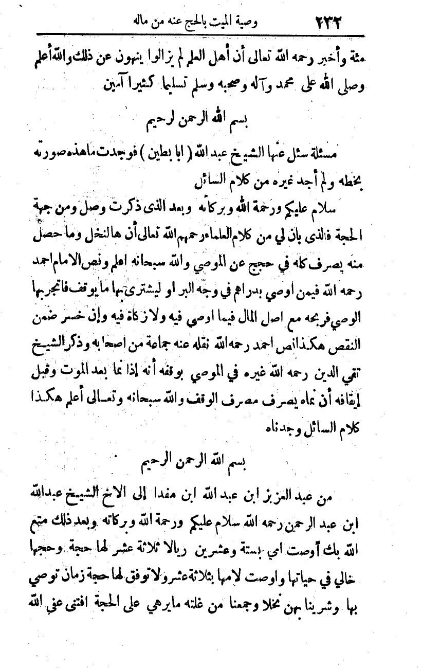 مسألة سئل عنها الشيخ عبد الله (أبا بطين) فوجدت ما هذه صورته بخطه، ولم أجد غيره من كلام السائل.