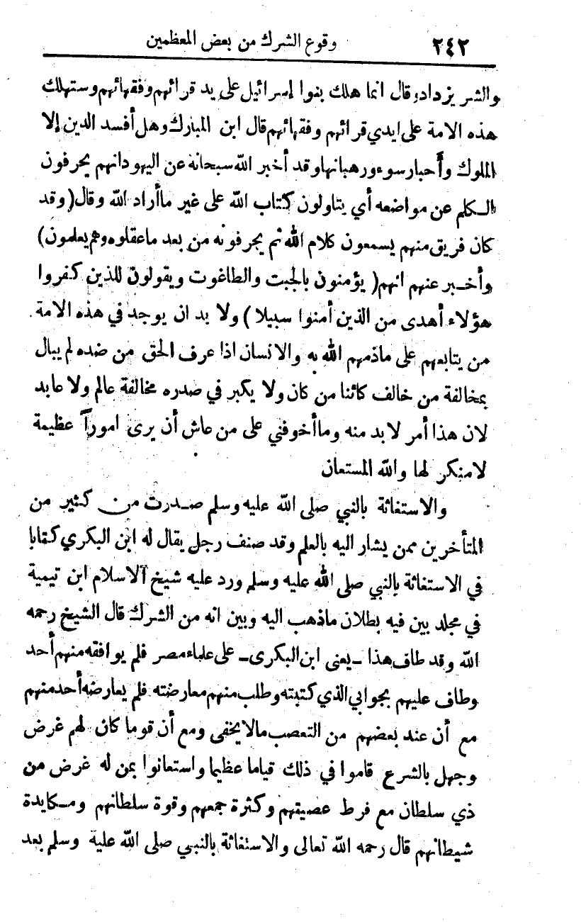 والاستغاثة بالنبي -صلى الله عليه وسلم- صدرت من كثير من المتأخرين ممن يُشَار إليه بالعلم. وقد صنَّف رجلٌ يقال له: ابن البكري كتابا في الاستغاثة بالنبي صلى الله عليه وسلم، ورد عليه شيخ الإسلام ابن تيمية في مجلد، بيَّن فيه بطلان ما ذهب إليه، وبيَّن أنه من الشرك.