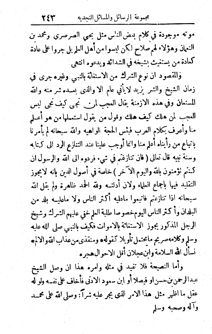 وأما النصيحة فلا تفيد في مثله، وأمره هذا، إن وصل الشيخ عبد الرحمن بن حسن أو فيصلا أو ابن سعود الأدنى فأخاف على نفسه، ولو له عقل ما أظهر مثل هذا الأمر الذي يجر عليه شَرًّا، وصلى الله على محمد وآله وصحبه وسلم.