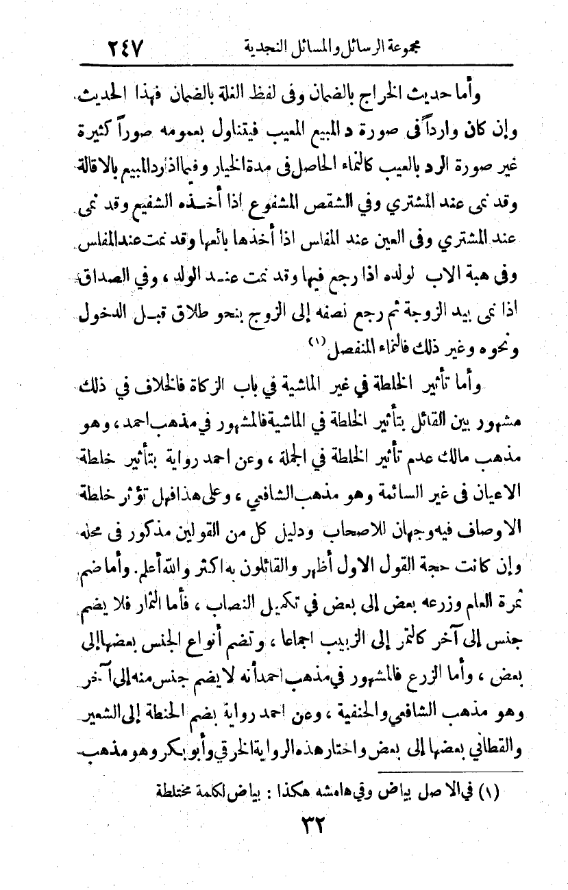وأما تأثير الخلطة في غير الماشية في باب الزكاة، فالخلاف في ذلك مشهور بين القائل بتأثير الخلطة في الماشية، فالمشهور في مذهب أحمد، وهو مذهب مالك، عدم تأثير الخلطة في الجملة. وعن أحمد رواية بتأثير خلطة الأعيان في غير السائمة، وهو مذهب الشافعي. وعلى هذا، فهل تؤثر خلطة الأوصاف؟ فيه وجهان للأصحاب، ودليل كل من القولين مذكور في محله، وإن كانت حجة القول الأول أظهر، والقائلون به أكثر، والله أعلم.