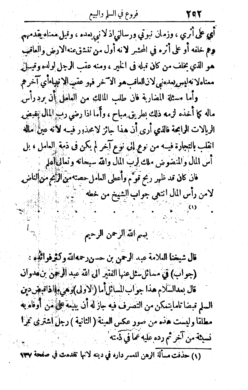 قال شيخنا العلامة عبد الرحمن بن حسن -رحمه الله، وكثَّر فوائده-: (جواب) في مسائل سئل عنها الفقير إلى الله عبد الرحمن بن عدوان، قال بعد السلام: هذا جواب المسائل: