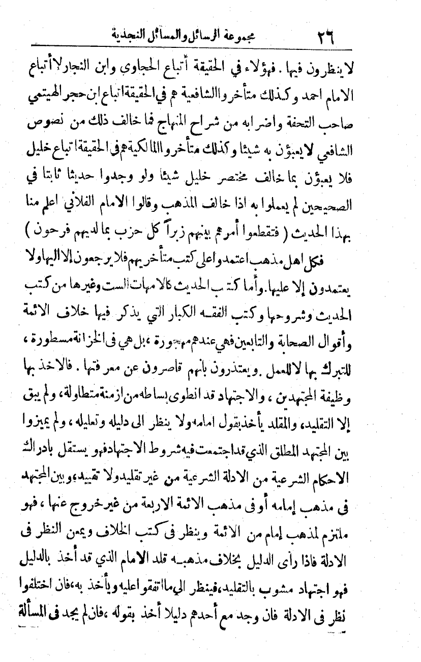 وأما كتب الحديث -كالأمهات الست وغيرها من كتب الحديث وشروحها-، وكتب الفقه الكبار التي يذكر فيها خلاف الأئمة وأقوال الصحابة والتابعين، فهي عندهم مهجورة، بل هي في الخزانة مسطورة، للتبرك بها لا للعمل. ويعتذرون بأنهم قاصرون عن معرفتها؛ فالأخذ بها وظيفة المجتهدين، والاجتهاد قد انطوى بساطه من أزمنة متطاولة، ولم يبقَ إلا التقليد، والمقلِّد يأخذ بقول إمامه، ولا ينظر إلى دليلِه وتعليلِه.