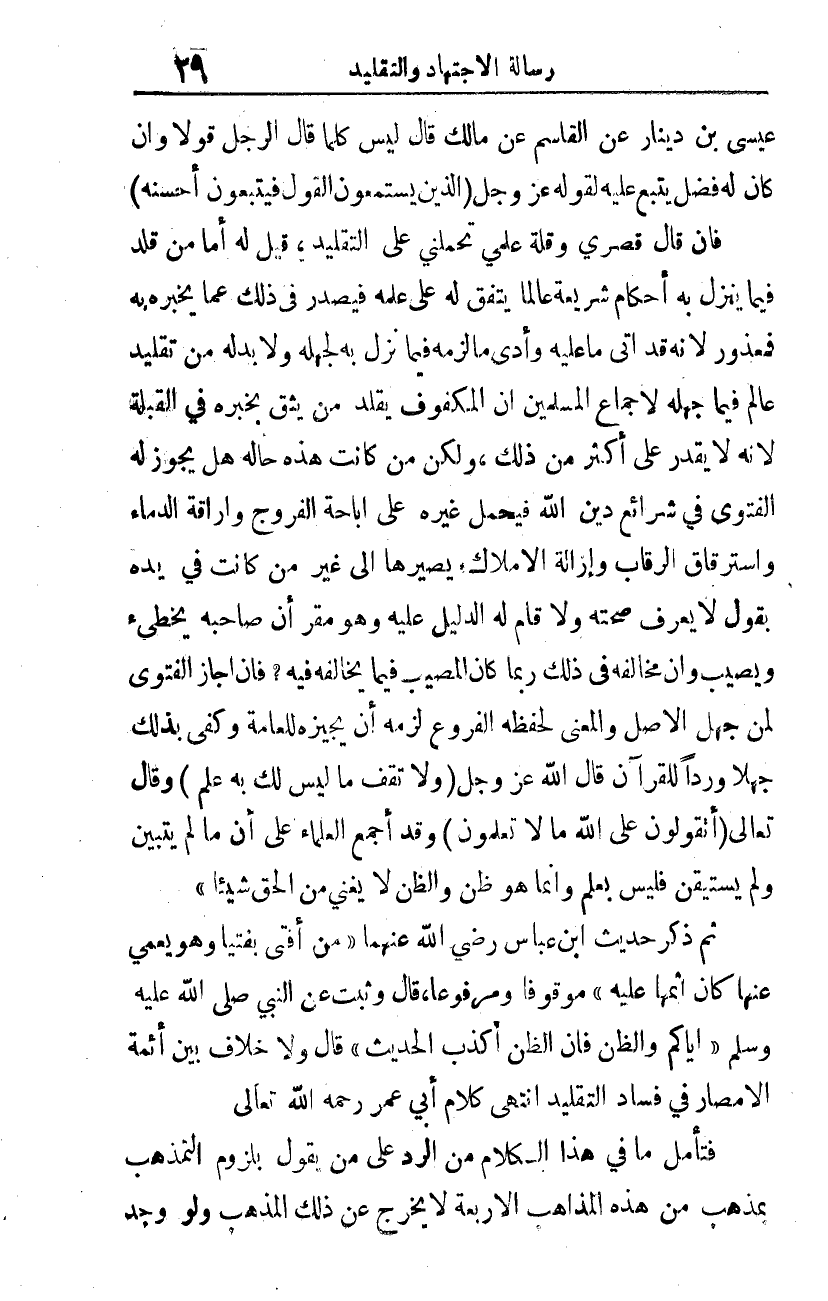ثم ذكر حديث ابن عباس -رضي الله عنهما-: "من أفتى بفتيا وهو يعمي عنها كان إثمها عليه"4 موقوفا ومرفوعا، قال وهب عن النبي صلى الله عليه وسلم: "إياكم والظن فإن الظن أكذب الحديث"5 قال: ولا خلاف بين أئمة الأمصار في فساد التقليد. انتهى كلام أبي عمر -رحمه الله تعالى-.
