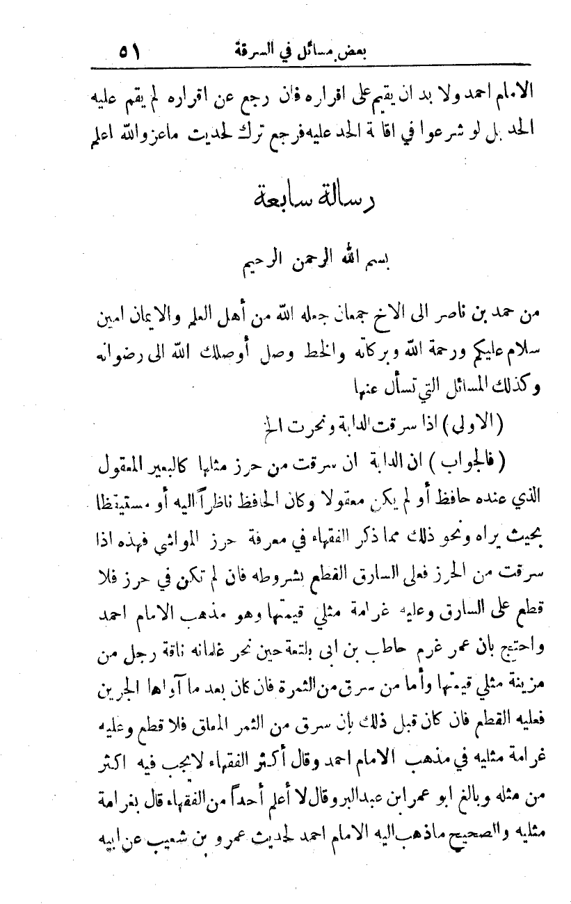 (فالجواب): إن الدابة إن سرقت من حرز مثلها كالبعير المعقول الذي عنده حافظ، أو لم يكن معقولا، وكان الحافظ ناظرا إليه أو مستيقظا بحيث يراه، ونحو ذلك مما ذكر الفقهاء في معرفة حرز المواشي، فهذه إذا سرقت من الحرز فعلى السارق القطع بشروطه. فإن لم تكن في حرز فلا قطع على السارق، وعليه غرامة مثلي قيمتها، وهو مذهب الإمام أحمد، واحتج بأن عمر غرم حاطب بن أبي بلتعة حين نحر غلمانه ناقة رجل من مزينة مثلي قيمتها.