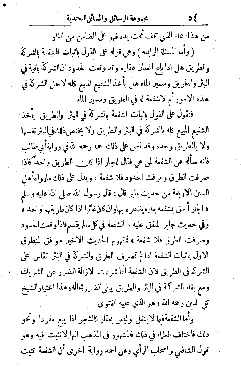 (وأما المسألة الرابعة) وهي قوله على القول بإثبات الشفعة بالشركة والطريق، هل إذا باع إنسان عقاره، وقد وقعت الحدود أن الشركة باقية في البئر والطريق ومسير الماء، هل يأخذ الشفيع المبيع كله لأجل الشركة في هذه الأمور؟ أم لا شفعة له في الطريق ومسير الماء؟