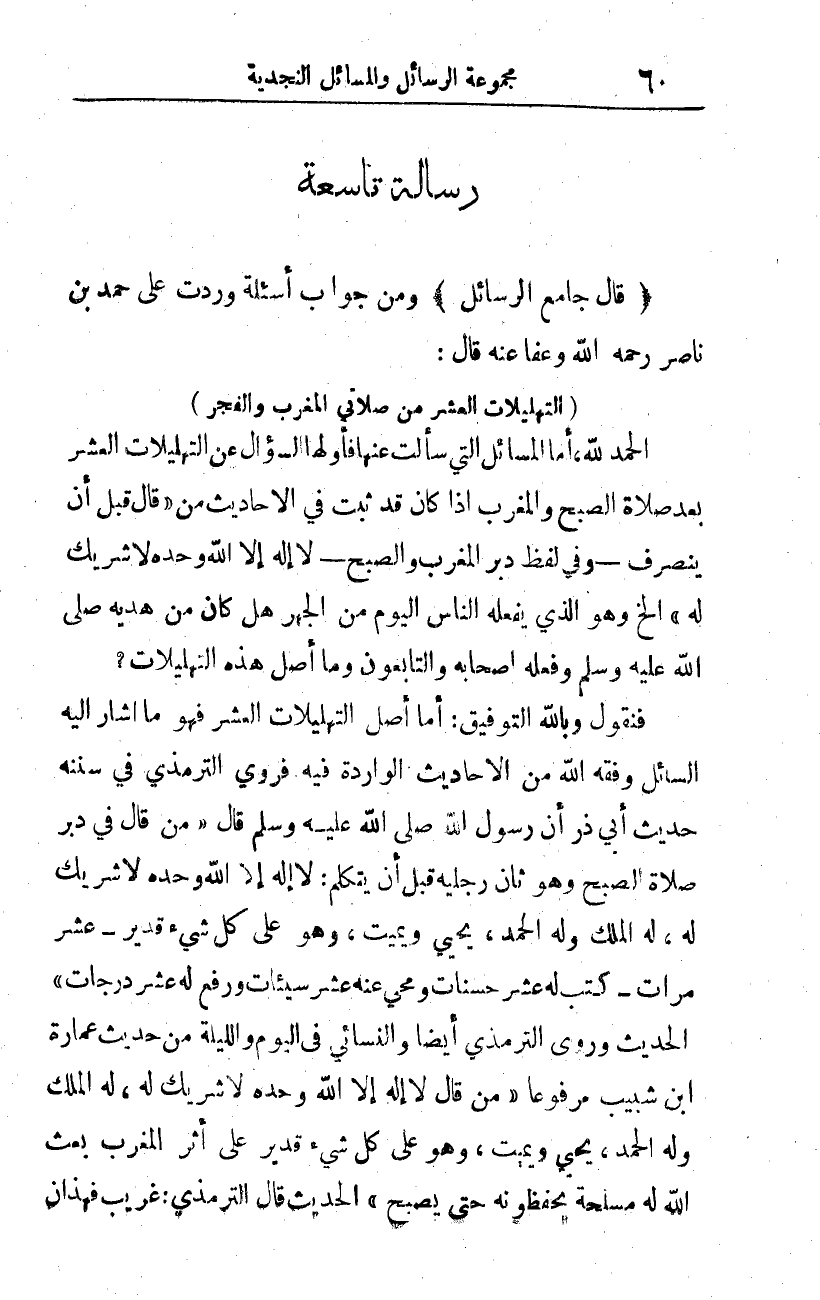 (قال جامع الرسائل): ومن جواب أسئلة وردت على حمد بن ناصر - رحمه الله وعفا عنه- قال: