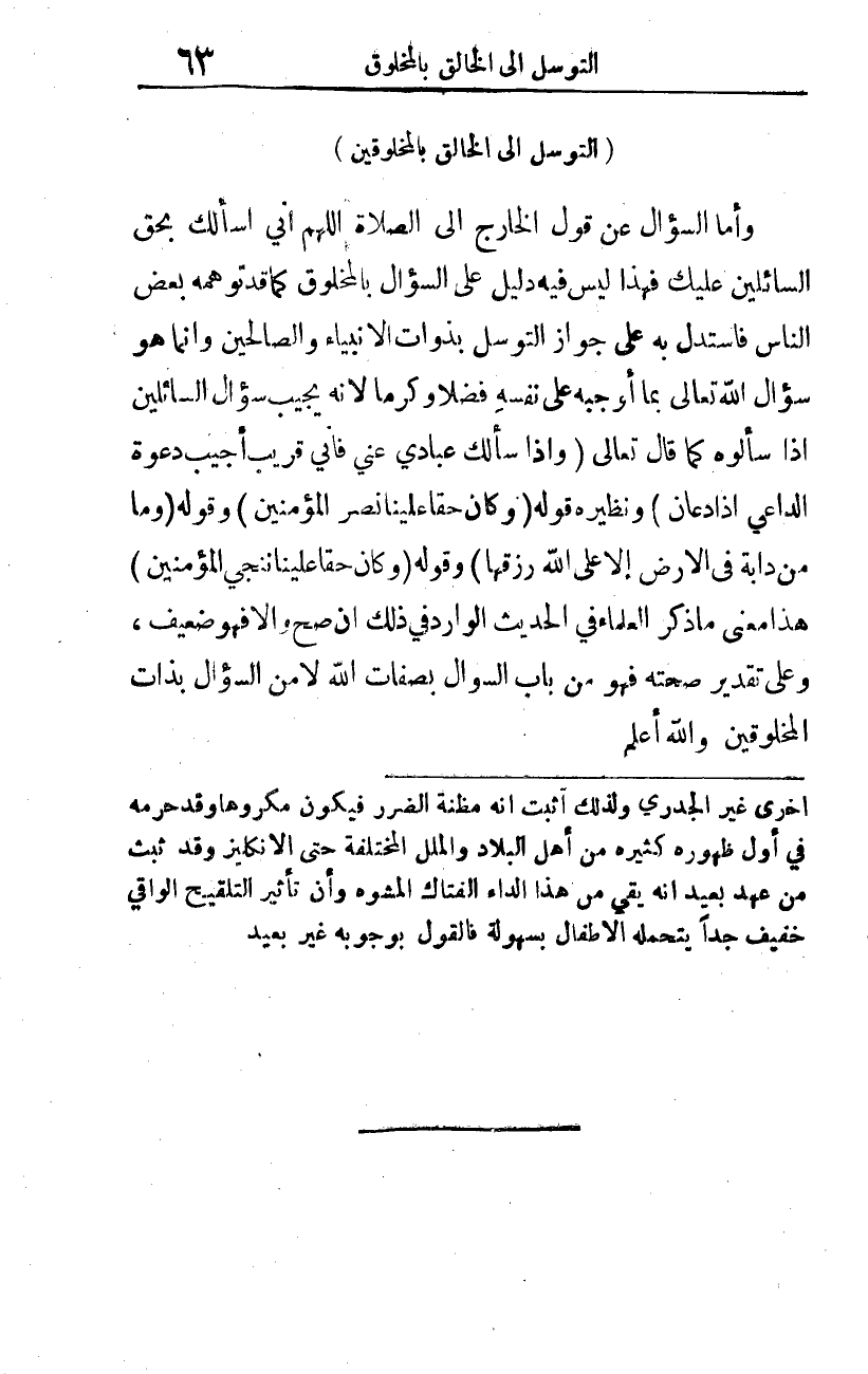وأما السؤال عن قول الخارج إلى الصلاة: اللهم إني أسألك بحق السائلين عليك، فهذا ليس فيه دليل على السؤال بالمخلوق كما قد توهمه بعض الناس، فاستدل به على جواز التوسل بذوات الأنبياء والصالحين، وإنما هو سؤال الله -تعالى- بما أوجبه على نفسه فضلا وكرما، لأنه يجيب سؤال السائلين إذا سألوه كما قال تعالى: {وَإِذَا سَأَلَكَ عِبَادِي عَنِّي فَإِنِّي قَرِيبٌ أُجِيبُ دَعْوَةَ الدَّاعِ إِذَا دَعَانِ} 1، ونظيره قوله: {وَكَانَ حَقًّا عَلَيْنَا نَصْرُ الْمُؤْمِنِينَ} 2، وقوله {وَمَا مِنْ دَابَّةٍ فِي الأَرْضِ إِلَّا عَلَى اللَّهِ رِزْقُهَا} 3، وقوله: {كَذَلِكَ حَقًّا عَلَيْنَا نُنْجِ الْمُؤْمِنِينَ} 4.