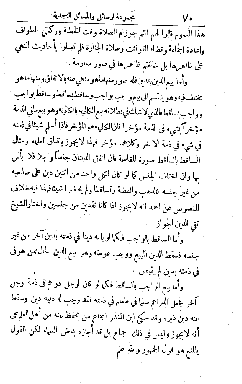 وأما بيع الدين بالدين، فله صور: منها ما هو منهي عنه بالاتفاق، ومنها ما هو مختلف فيه. وهو ينقسم إلى بيع واجب بواجب، وساقط بساقط، وساقط بواجب، وواجب بساقط. فالذي لا شك في بطلانه بيع الكالئ بالكالئ، وهو بيع ما في الذمة مؤخرا بشيء في الذمة مؤخرا، فإن الكالئ هو المؤخر فإذا أسلم شيئا في ذمته في شيء في ذمة الآخر، وكلاهما مؤخر، فهذا لا يجوز باتفاق العلماء. ومثال الساقط بالساقط صورة المقاصة، فإن اتفق الدينان جنسا وأجلا فلا بأس بها، وإن اختلف الجنس كما لو كان لكل واحد من اثنين دين على صاحبه من غير جنسه كالذهب والفضة وتساقطا، ولم يحضرا شيئا فهذا فيه خلاف المنصوص عن أحمد أنه لا يجوز إذا كانا نقدين من جنسين، واختار الشيخ تقي الدين الجواز.