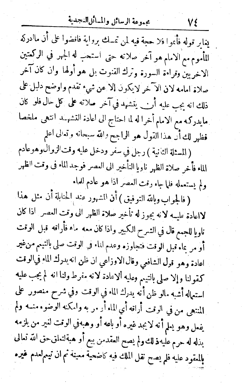 (المسألة الثانية): رجل في سفر، ودخل عليه وقت الزوال، وهو عادم الماء، فأخر صلاة الظهر ناويا التأخير إلى العصر، فوجد الماء في وقت الظهر، ولم يستعمله؛ فلما جاء وقت العصر إذا هو عادم للماء؟
