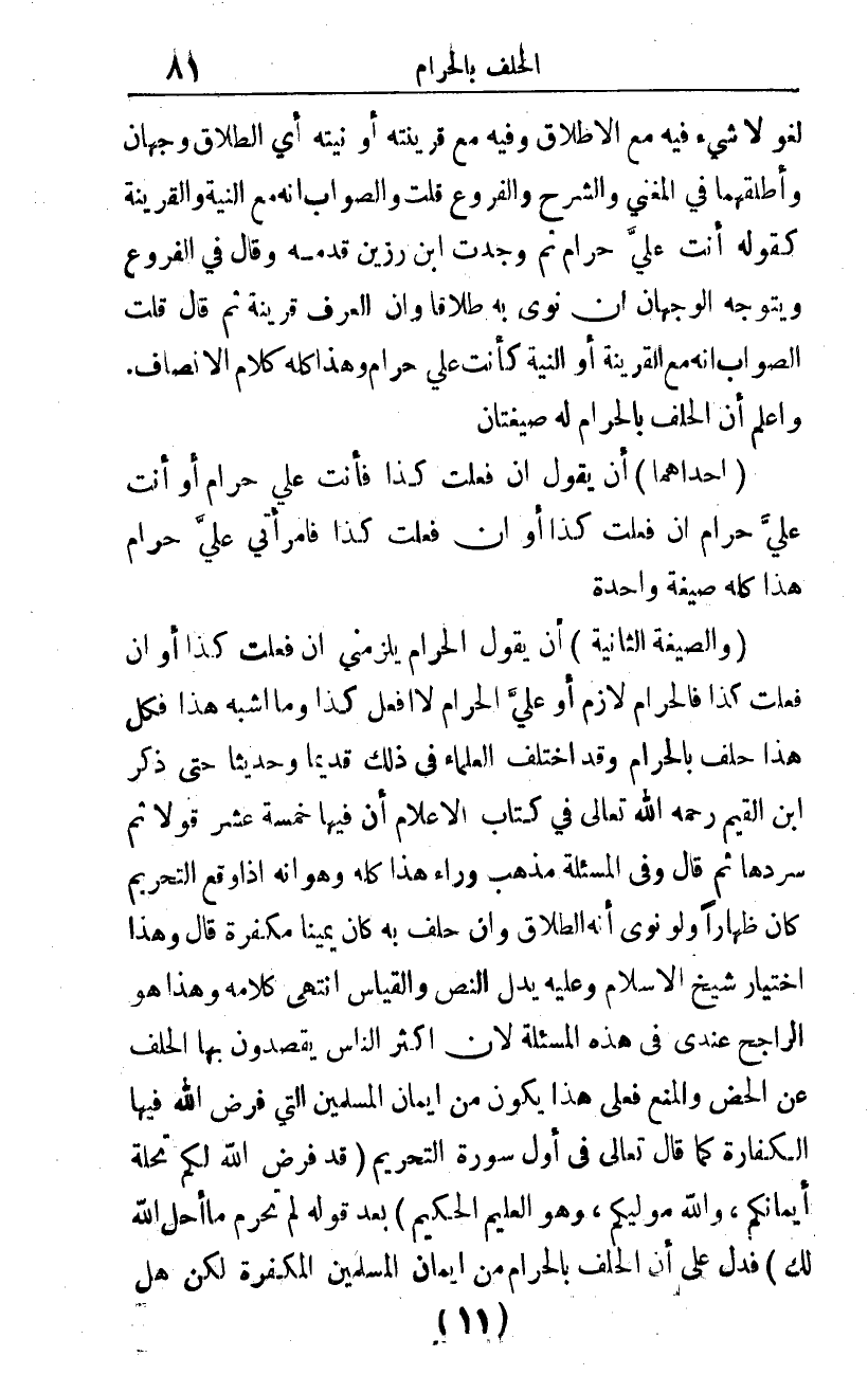 (والصيغة الثانية): أن يقول: الحرام يلزمني إن فعلت كذا، أو إن فعلت كذا فالحرام لازم، أو علي الحرام لا أفعل كذا، وما أشبه هذا؛ فكل هذا حلف بالحرام، وقد اختلف العلماء في ذلك قديما وحديثا حتى ذكر ابن القيم -رحمه الله تعالى- في كتاب الإعلام أن فيها خمسة عشر قولا، ثم سردها، ثم قال: وفي المسألة مذهب وراء هذا كله، وهو أنه إذا وقع التحريم كان ظهارا، ولو نوى أنه الطلاق، وإن حلف به كان يمينا مكفرة، قال: وهذا اختيار شيخ الإسلام، وعليه يدل النص والقياس. انتهى كلامه.
