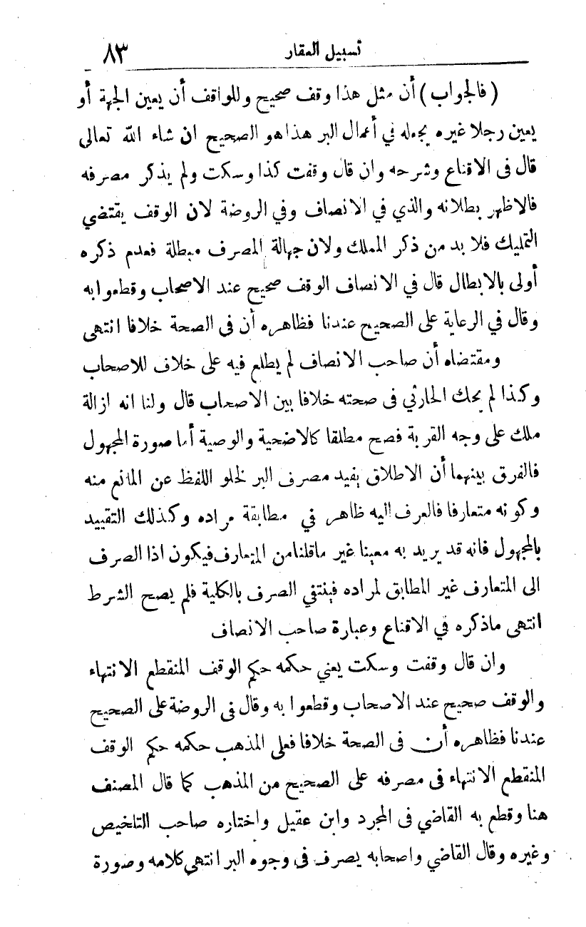 ومقتضاه أن صاحب الإنصاف لم يطلع فيه على خلاف للأصحاب، وكذا لم يحك الحارثي في صحته خلافا بين الأصحاب، قال: ولنا أنه إزالة ملك على وجه القربة، فصح مطلقا كالأضحية والوصية. أما صورة المجهول فالفرق بينهما أن الإطلاق يفيد مصرف البر لخلو اللفظ عن المانع منه، وكونه متعارفا فالعرف إليه ظاهر في مطابقة مراده، وكذلك التقييد بالمجهول، فإنه قد يريد به معينا غير ما قلنا من المتعارف، فيكون إذا الصرف إلى المتعارف غير المطابق لمراده، فينتفي الصرف بالكلية، فلم يصح الشرط. انتهى ما ذكره في الإقناع.