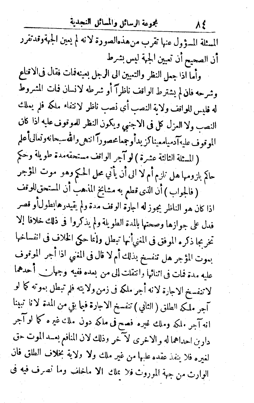 (فالجواب): أن الذي قطع به مشايخ المذهب أن المستحق للوقف إذا كان هو الناظر، يجوز له إجارة الوقف مدة، ولم يقيدوها بطول أو قصر، فدل على جوازها وصحتها بالمدة الطويلة، ولم يذكروا في ذلك خلافا إلا تخريجا ذكره الموفق في المغني أنها تبطل. وإنما حكى الخلاف في انفساخها بموت المؤجر، هل تنفسخ بذلك أم لا؟ قال في المغني: إذا أجر الموقوف عليه مدة، فمات في أثنائها وانتقلت إلى من بعده، ففيه وجهان: (أحدهما): لا تنفسخ الإجارة لأنه أجر ملكه في زمن ولايته، فلم تبطل بموته كما لو آجر ملكه الطلق. (الثاني) تنفسخ الإجارة فيما بقي من المدة لأنا تبينا أنه آجر ملكه وملك غيره، فصح في ملكه دون ملك غيره كما لو آجر دارين إحداهما له، والأخرى لآخر، وذلك لأن المنافع بعد الموت حق لغيره، فلا ينفذ عقده عليها من غير ملك، ولا ولاية بخلاف الطلق، فإن الوارث من جهة الموروث، فلا يملك إلا ما خلف، وما تصرف فيه في
