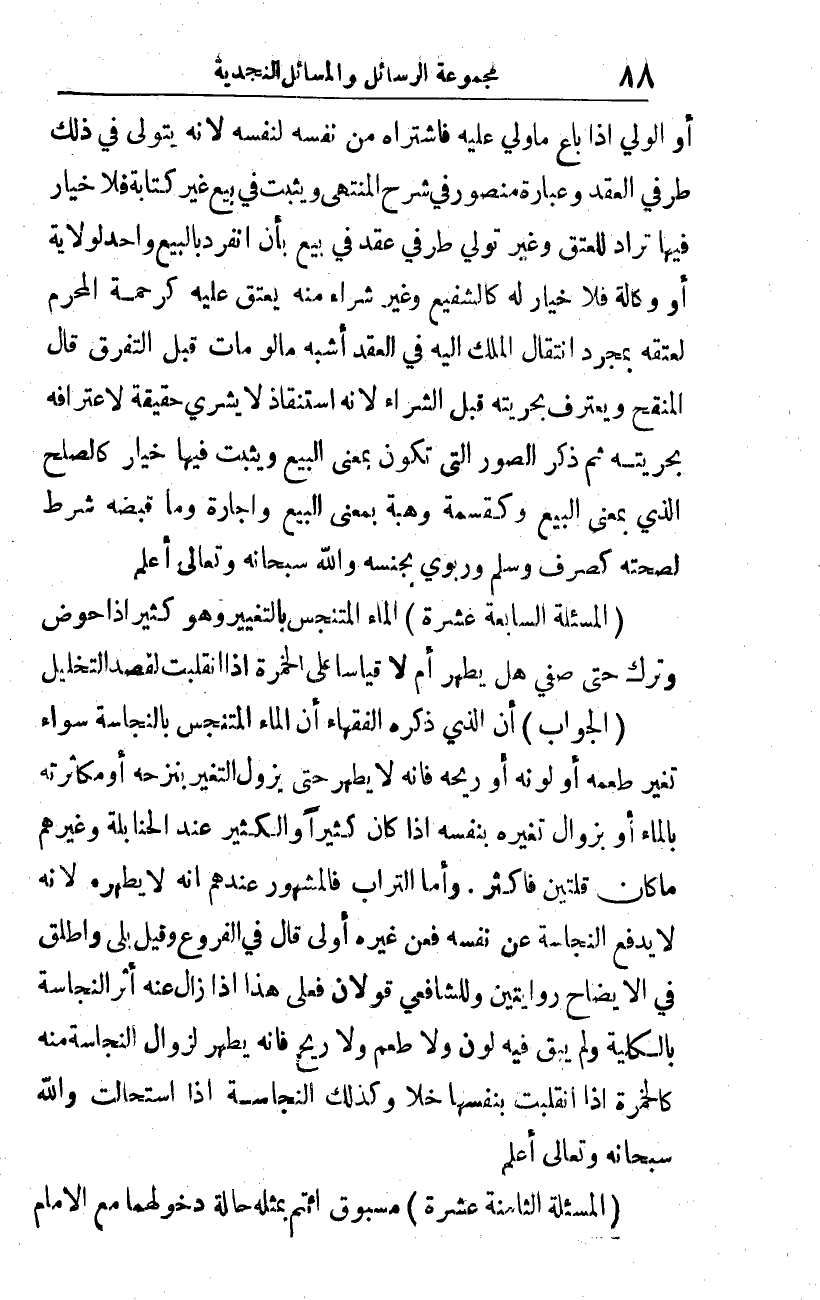(المسألة السابعة عشرة): الماء المتنجس بالتغيير وهو كثير، إذا حوض وترك حتى صفي، هل يطهر أم لا؟ قياسا على الخمرة إذا انقلبت لقصد التخليل.