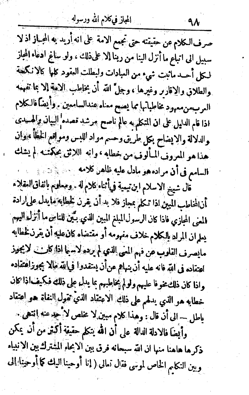 قال شيخ الإسلام ابن تيمية في أثناء كلام له*: ومعلوم باتفاق العقلاء أن المخاطب المبين إذا تكلم بمجاز، فلا بد أن يقرن لخطابه ما يدل على إرادة المعنى المجازي، فإذا كان الرسول المبلغ المبين الذي بين للناس ما أنزل إليهم يعلم أن المراد بالكلام خلاف مفهومه أو مقتضاه، كان عليه أن يقرن لخطابه ما يصرف القلوب عن فهم المعنى الذي لم يرده، لا سيما إذا كان لا يجوز اعتقاده في الله، فإنه عليه أن ينهاهم عن أن يعتقدوا في الله ما لا يجوز اعتقاده، وإذا كان ذلك مخوفا عليهم، ولو لم يخاطبهم بما يدل على ذلك، فكيف إذا كان خطابه هو الذي يدلهم على ذلك الاعتقاد الذي تقول النفاة هو اعتقاد باطل - إلى أن قال: وهذا كلام مبين لا مخلص لأحد عنه. انتهى.