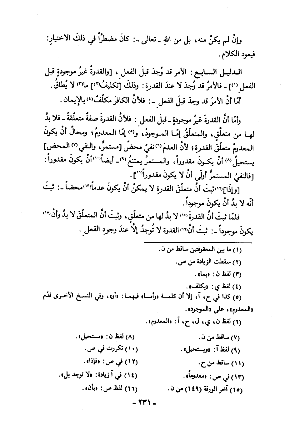 الفعل فالأمر قد وجد لا عند القدرة وذلك تكليف ما لا يطاق أما أن الأمر قد وجد قبل الفعل فلأن الكافر مكلف بالإيمان وأما أن القدرة غير موجودة قبل الفعل فلأن القدرة صفة متعلقة فلا بد لها من متعلق والمتعلق إما الموجود وإما المعدوم ومحال أن يكون المعدوم متعلق القدرة لأن العدم نفي محض مستمر والنفي المحض يستحيل أن يكون مقدورا والمستمر يمتنع أيضا أن يكون مقدورا فالنفي المستمر اولى أن لا يكون مقدورا وإذا ثبت أن متعلق القدرة لا يمكن أن يكون عدما محضا ثبت أنه لا بد أن يكون موجودا فلما ثبت أن القدرة لا بد لها من معلق وثبت أن المتعلق لا بد وأن يكون موجودا ثبت أن القدرة لا توجد إلا عند وجود الفعل.