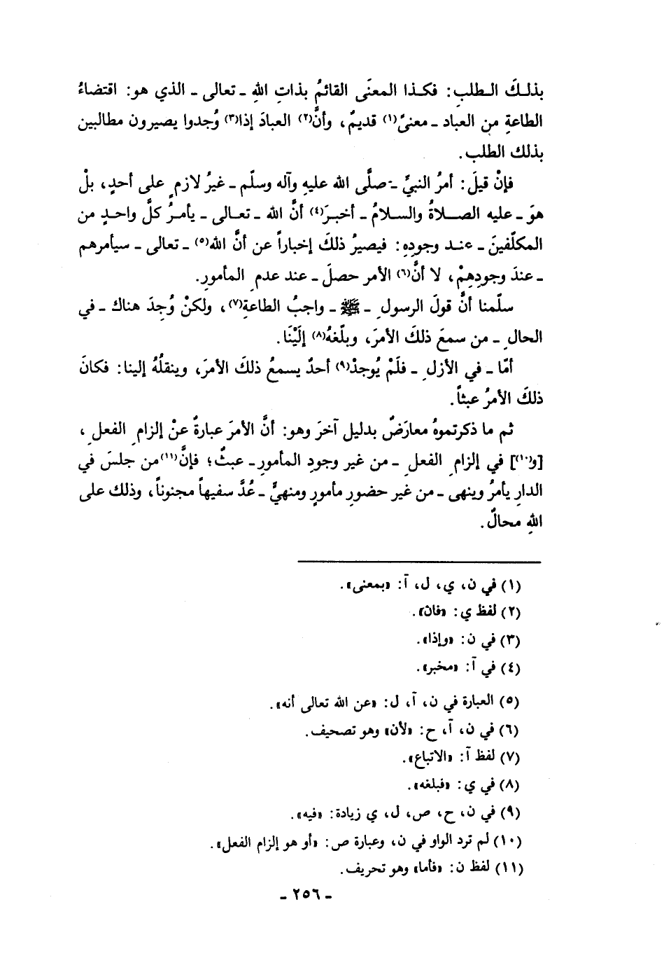 بذلك الطلب فكذا المعنى القائم بذات الله تعالى الذي هو اقتضاء الطاعة من العباد معنى قديم وأن العباد إذا وجدوا يصيرون مطالبين بذلك الطلب فإن قيل أمر النبي ص غير لازم على أحد بل هو عليه الصلاة والسلام أخبر أن الله تعالى يأمر كل واحد من المكلفين عند وجوده فيصير ذلك إخبارا عن أن الله تعالى سيأمرهم عند وجودهم لا أن الأمر حصل عند عدم المأمور سلمنا أن قول الرسول ص واجب الطاعة ولكن وجد هناك في الحال من سمع ذلك الأمر وبلغه إلينا أما في الأزل فلم يوجد أحد يسمع ذلك الأمر وينقله إلينا فكان ذلك الأمر عبثا ثم ما ذكرتموه معارض بدليل آخر وهو أن الأمر عبارة عن إلزام الفعل وفي إلزام الفعل من غير وجود المأمور عبث فإن من جلس في الدار يأمر وينهي من غير حضور مأمور ومنهي عد سفيها مجنونا وذلك على الله محال