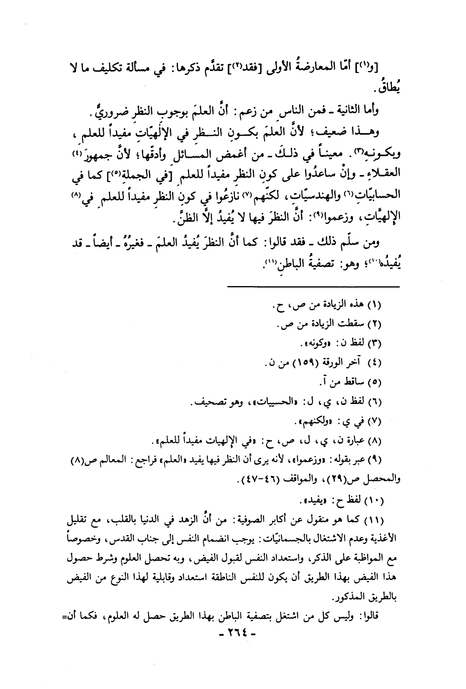 وأما المعارضة الأولى فقد تقدم ذكرها في مسألة تكليف مالا يطاق وأما الثانية فمن الناس من زعم أن العلم بوجوب النظر ضروري وهذا ضعيف لأن العلم بكون النظر في الإلهيات مفيدا للعلم وبكونه معينا في ذلك من أغمض المسائل وأدقها لأن جمهور العقلاء وإن ساعدوا على كون النظر مفيدا للعلم في الجملة كما في الحسابيات والهندسيات لكنهم نازعوا في كون النظر مفيدا للعلم في الإلهيات وزعموا أن النظر فيها لا يفيد إلا الظن ومن سلم ذلك فقد قالوا كما أن النظر يفيد العلم فغيره ايضا قد يفيده وهو تصفية الباطن