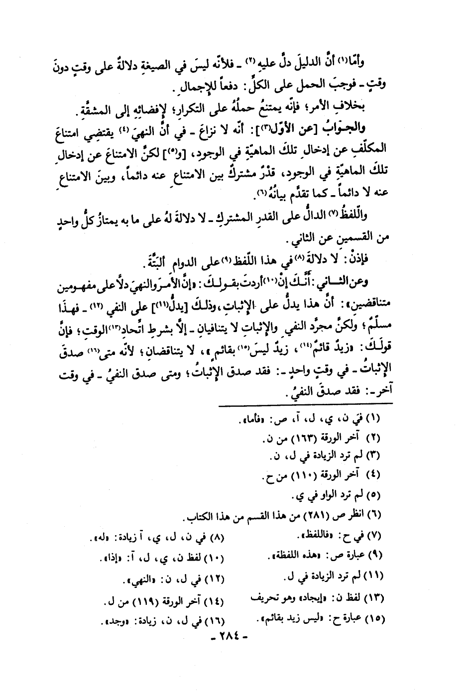 عنه لا دائما كما تقدم بيانه واللفظ الدال على القدر المشترك لا دلالة له على ما به يمتاز كل واحد من القسمين عن الثاني فإذن لا دلالة في هذا اللفظ على الدوام البتة وعن الثاني إنك إن أردت بقولك إن الأمر والنهي دلا على مفهومين متناقضين أن هذا يدل على الإثبات وذلك يدل على النفي فهذا مسلم ولكن مجرد النفي والاثبات لا يتنافيان إلا بشرط اتحاد الوقت فإن قولك زيد قائم زيد ليس بقائم لا يتناقضان لأنه متى صدق الإثبات في وقت واحد فقد صدق الإثبات ومتى صدق النفي في وقت آخر فقد صدق النفي