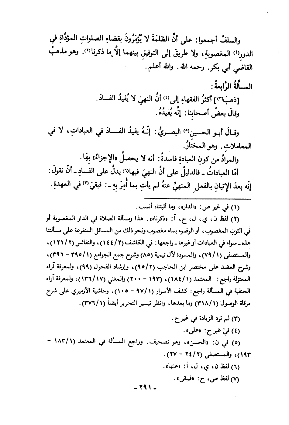 والسلف أجمعوا على أن الظلمة لا يؤمرون بقضاء الصلوات المؤداة في الدور المغصوبة ولا طريق إلى التوفيق بيهما إلا ما ذكرناه وهو مذهب القاضي أبي بكر رحمه الله والله أعلم المسألة الرابعة ذهب أكثر الفقهاء إلى أن النهي لا يفيد الفساد وقال بعض أصحابنا أنه يفيده وقال أبو الحسين البصري أنه يفيد الفساد في العبادات لا في