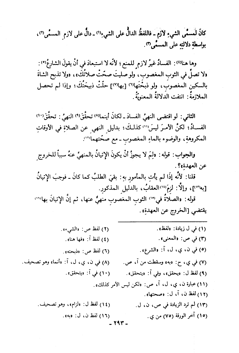 كان لمسمى الشئ لازم فاللفظ الدال على الشئ دال على لازم المسمى بواسطة دلالته على المسمى وها هنا الفساد غير لازم للمنع لأنه لا استبعاد في أن يقول الشارع لا تصل في الثوب المغصوب ولو صليت صحت صلاتك ولا تذبح الشاة بالسكين المغصوب ولو ذبحتها بها حلت ذبيحتك وإذا لم تحصل الملازمة انتفت الدلالة المعنوية الثاني لو اقتضى النهي الفساد لكان أينما تحقق النهي تحقق الفساد لكن الأمر ليس كذلك بدليل النهي عن الصلاة في الأوقات المكروهة والوضوء بالماء المغصوب مع صحتهما والجواب قوله لم لا يجوز أن يكون الإتيان بالمنهي عنه سببا للخروج عن العهدة قلنا لأنه إذا لم يأت بالمأمور به بقي الطلب كما كان فوجب الإتيان به وإلا لزم العقاب بالدليل المذكور قوله الصلاة في الثوب المغصوب منهي عنها ثم إن الإتيان بها يقتضي الخروج عن العهدة