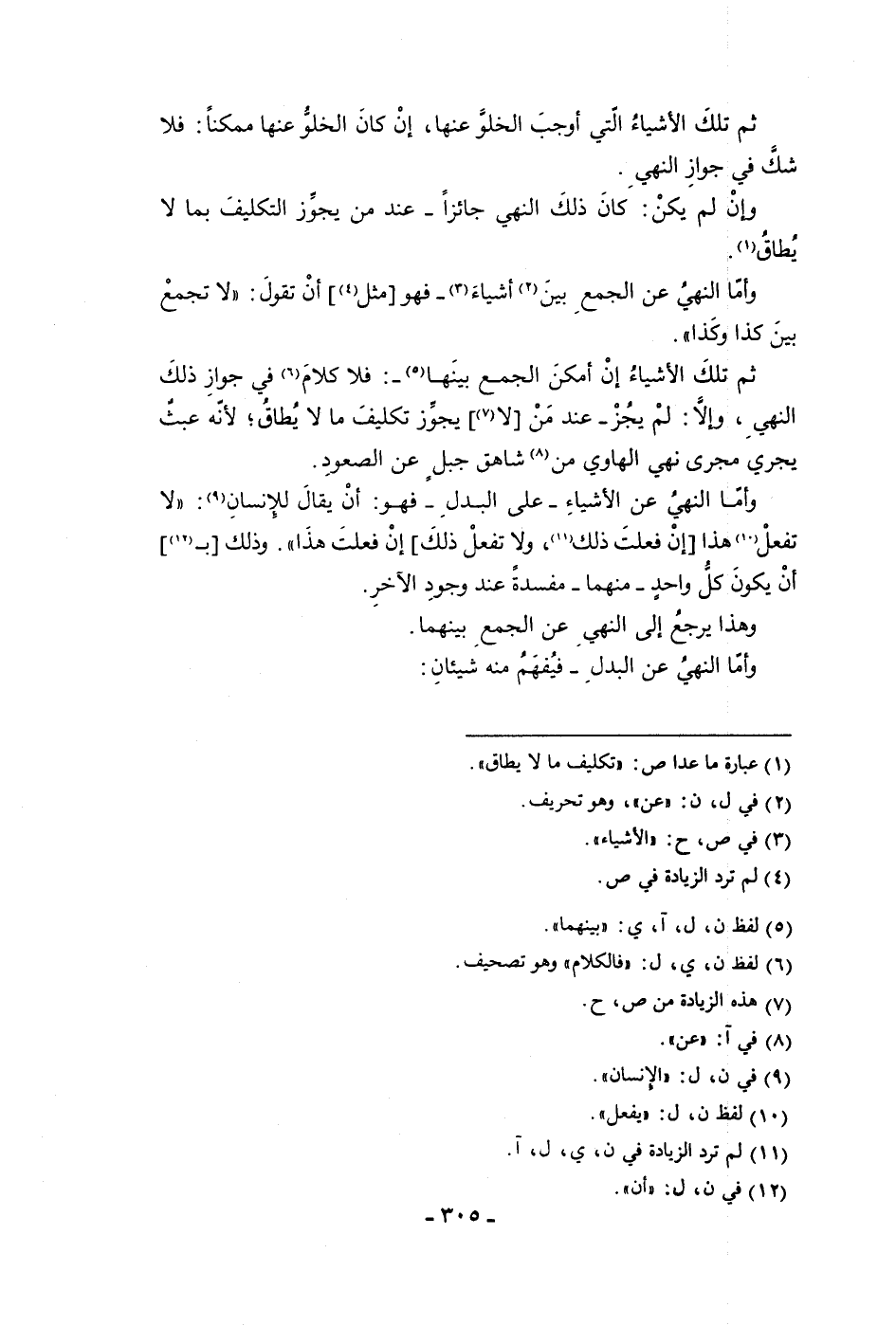 ثم تلك الأشياء التي أوجب الخلو عنها إن كان الخلو عنها ممكنا فلا شك في جواز النهي وإن لم يكن كان ذلك النهي جائزا عند من يجوز التكليف بمالا يطاق وأما النهي عن الجمع بين أشياء فهو مثل أن تقول لا تجمع بين كذا وكذا ثم تلك الأشياء إن أمكن الجمع بينها فلا كلام في جواز ذلك النهي وإلا لم يجز عند من لا يجوز تكليف مالا يطاق لأنه عبث يجري مجرى نهي الهاوي من شاهق جبل عن الصعود وأما النهي عن الأشياء على البدل فهو أن يقال للإنسان لا تفعل هذا إن فعلت ذلك ولا تفعل ذلك إن فعلت هذا وذلك ب أن يكون كل واحد منهما مفسده عند وجود الآخر وهذا يرجع إلى النهي عن الجمع بينهما وأما النهي عن البدل فيفهم منه شيئان