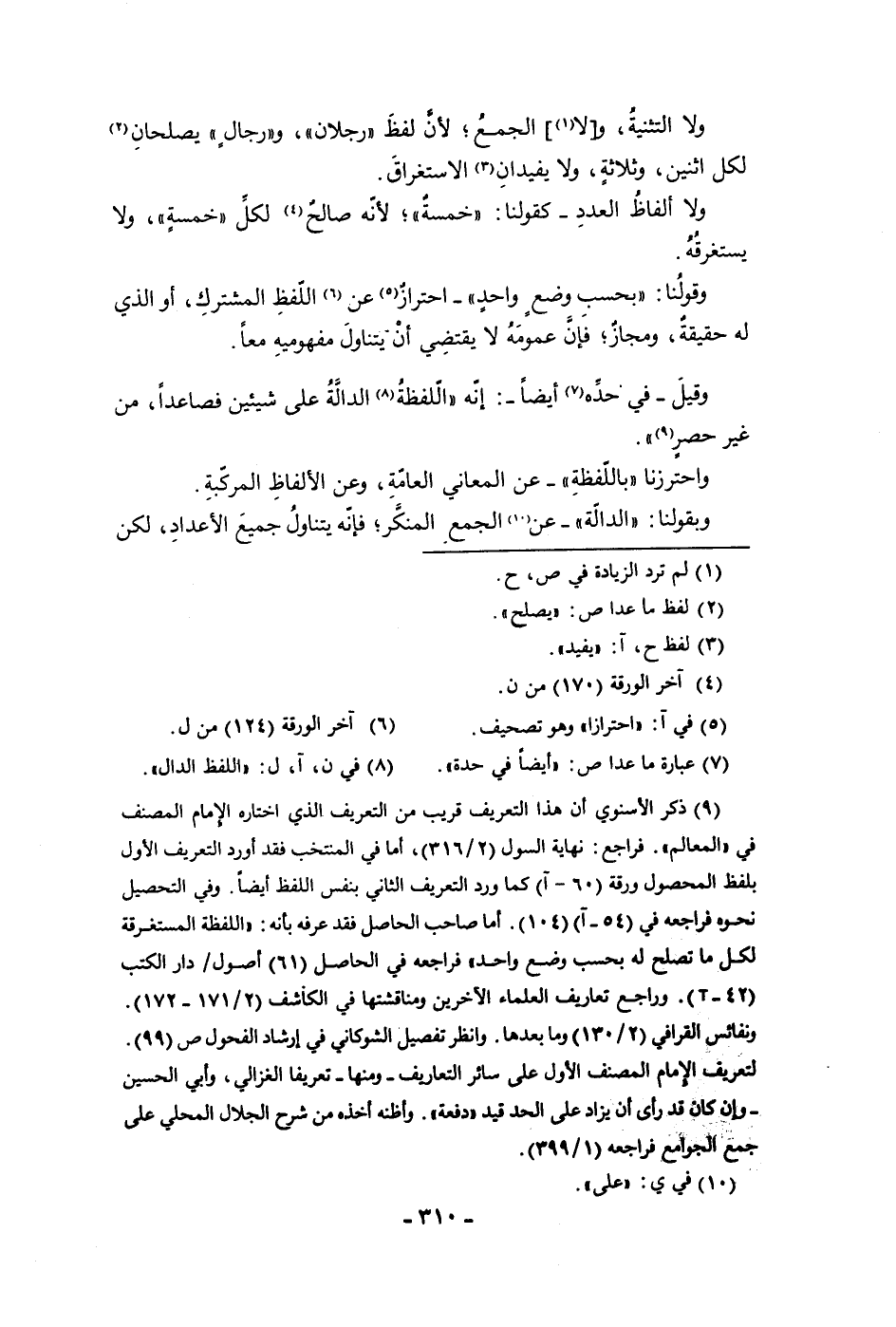 وقولنا بحسب وضع واحد احتراز عن اللفظ المشترك أو الذي له حقيقة ومجاز فإن عمومه لا يقتضي أن يتناول مفهوميه معا وقيل في حده أيضا إنه اللفظة الدالة على شيئين فصاعدا من غير حصر واحترزنا باللفظة عن المعاني العامة وعن الألفاظ المركبة وبقولنا الدالة عن الجمع المنكر فإنه يتناول جميع الأعداد لكن