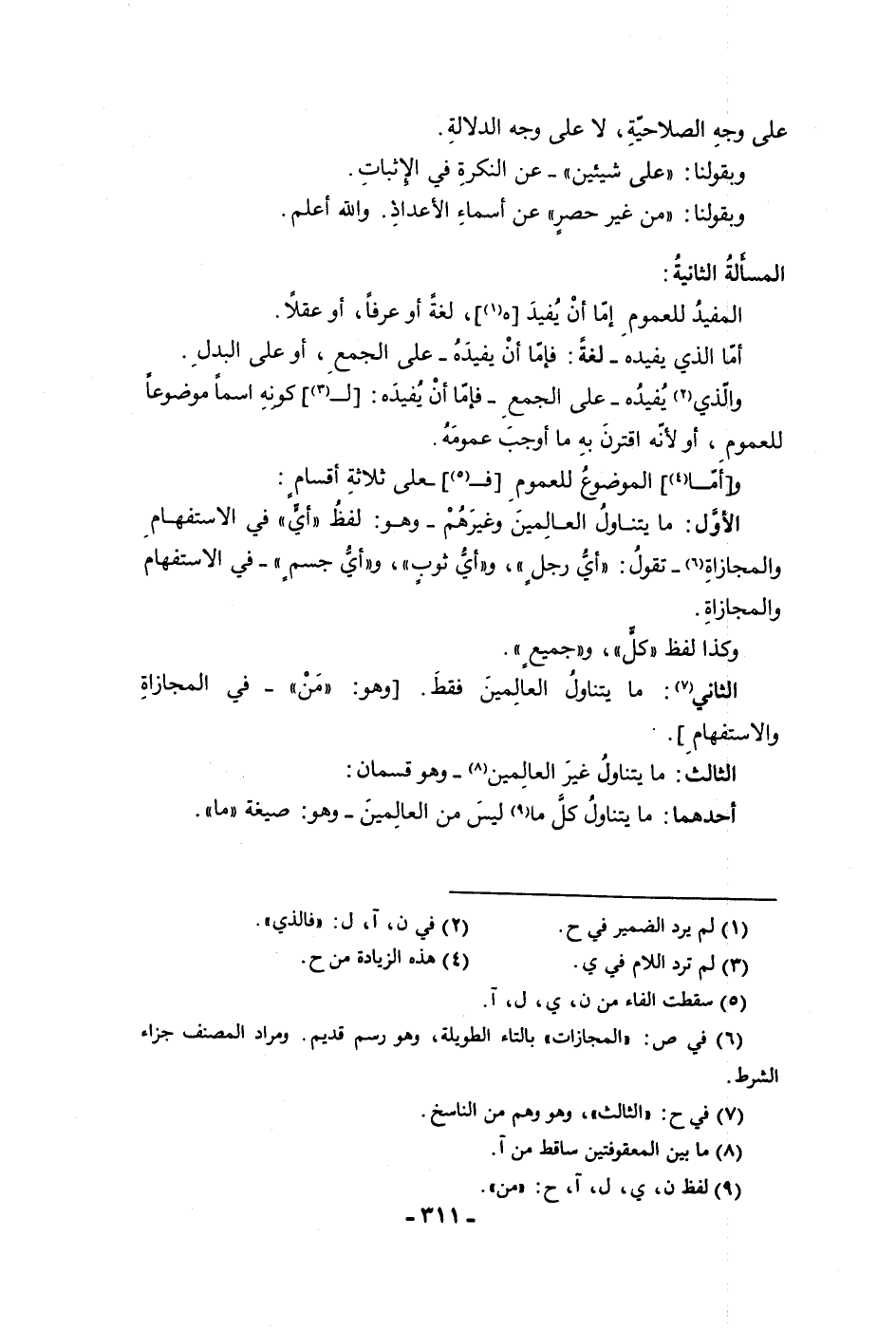 على وجه الصلاحية لا على وجه الدلالة وبقولنا على شيئين عن النكرة في الإثبات وبقولنا من غير حصر عن أسماء الأعداد والله أعلم المسألة الثانية المفيد للعموم إما أن يفيد لغة أو عرفا أو عقلا أما الذي يفيده لغة فإما أن يفيده على الجمع أو على البدل والذي يفيده على الجمع فإما أن يفيده كونه اسما موضوعا للعموم أو لأنه اقترن به ما أوجب عمومه وأما الموضوع للعموم فعلى ثلاثة أقسام الأول ما يتناول العالمين وغيرهم وهو لفظ أي في الاستفهام والمجازاة تقول أي رجل وأي ثوب وأي جسم في الاستفهام والمجازاة وكذا لفظ كل وجميع الثاني ما يتناول العالمين فقط وهو من في المجازاة والاستفهام