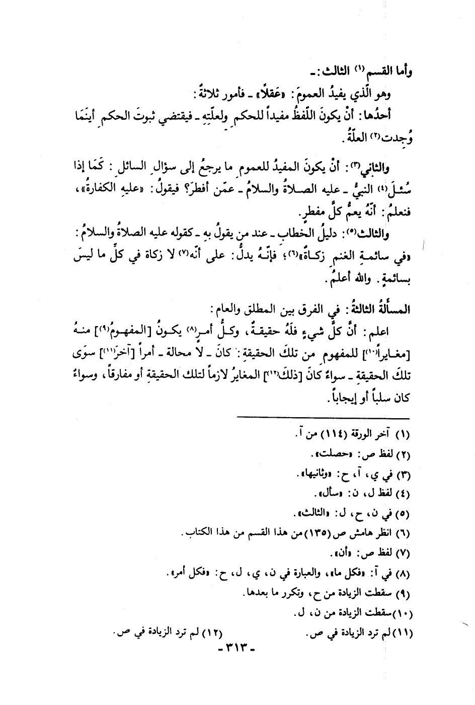 والثاني أن يكون المفيد للعموم ما يرجع إلى سؤال السائل كما إذا سئل النبي عليه الصلاة والسلام عمن أفطر فيقول عليه الكفارة فنعلم أنه يعم كل مفطر والثالث دليل الخطاب عند من يقول به كقوله عليه الصلاة والسلام في سائمة الغنم زكاة فإنه يدل على أنه لا زكاة في كل ما ليس بسائمة والله أعلم المسألة الثالثة في الفرق بين المطلق والعام اعلم أن كل شئ فله حقيقة وكل أمر يكون المفهوم منه مغايرا للمفهوم من تلك الحقيقة كان لا محالة أمرا آخر سوى تلك الحقيقة سواء كان ذلك المغاير لازما لتلك الحقيقة أو مفارقا وسواء كان سلبا أو إيجابا