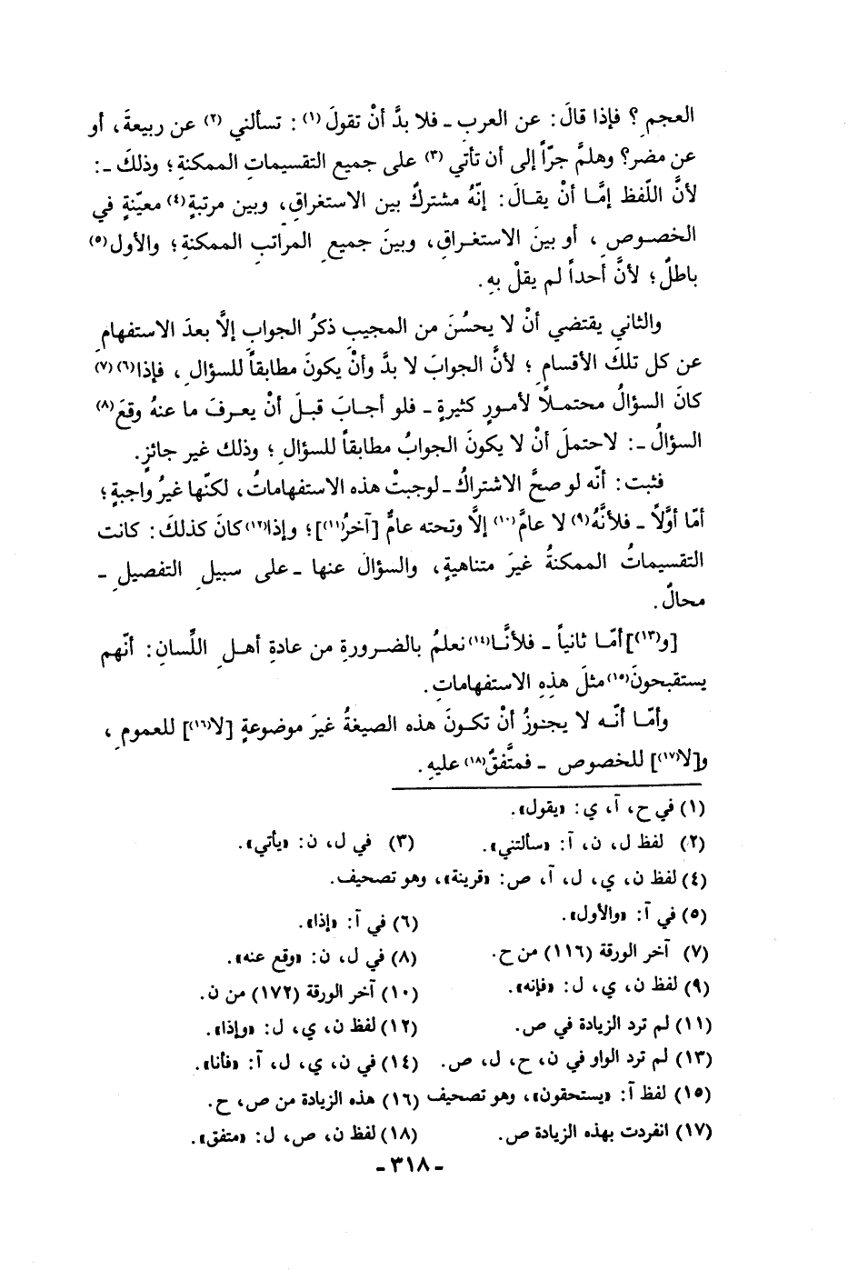 العجم فإذا قال عن العرب فلا بد أن تقول تسألني عن ربيعة أو عن مضر وهلم جرا إلى أن تأتي على جميع التقسيمات الممكنة وذلك لأن اللفظ إما أن يقال أنه مشترك بين الاستغراق وبين مرتبة معينة في الخصوص أو بين الاستغراق وبين جميع المراتب الممكنة والأول باطل لأن أحدا لم يقل به والثاني يقتضي أن لا يحسن من المجيب ذكر الجواب إلا بعد الاستفهام عن كل تلك الأقسام لأن الجواب لا بد وأن يكون مطابقا للسؤال فإذا كان السؤال محتملا لأمور كثيرة فلو أجاب قبل أن يعرف ما عنه وقع السؤال لاحتمل أن لا يكون الجواب مطابقا للسؤال وذلك غير جائز فثبت أنه لو صح الاشتراك لوجبت هذه الاستفهامات لكنها غير واجبة أما أولا فلأنه لا عام إلا وتحته عام آخر وإذا كان كذلك كانت التقسيمات الممكنة غير متناهية والسؤال عنها على سبيل التفصيل محال وأما ثانيا فلأنا نعلم بالضرورة من عادة أهل اللسان أنهم يستقبحون مثل هذه الاستفهامات وأما أنه لا يجوز أن تكون هذه الصيغة غير موضوعة للعموم