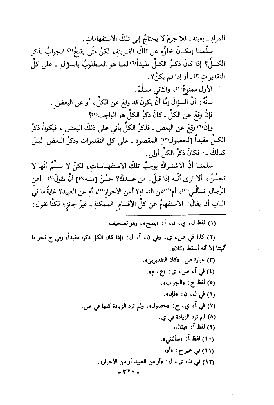 وإن وقع عن البعض فذكر الكل يأتي على ذلك البعض فيكون ذكر الكل مفيدا لحصول المقصود على كل التقديرات وذكر البعض ليس كذلك فكان ذكر الكل أولى سلمنا أن الاشتراك يوجب تلك الاستفهامات لكن لا نسلم أنها لا تحسن ألا ترى أنه إذا قيل من عندك حسن منه أن يقول أعن الرجال تسألني أم عن النساء أعن الأحرار أم عن العبيد غاية ما في الباب أن يقال الاستفهام عن كل الأقسام الممكنة غير جائز لكنا نقول