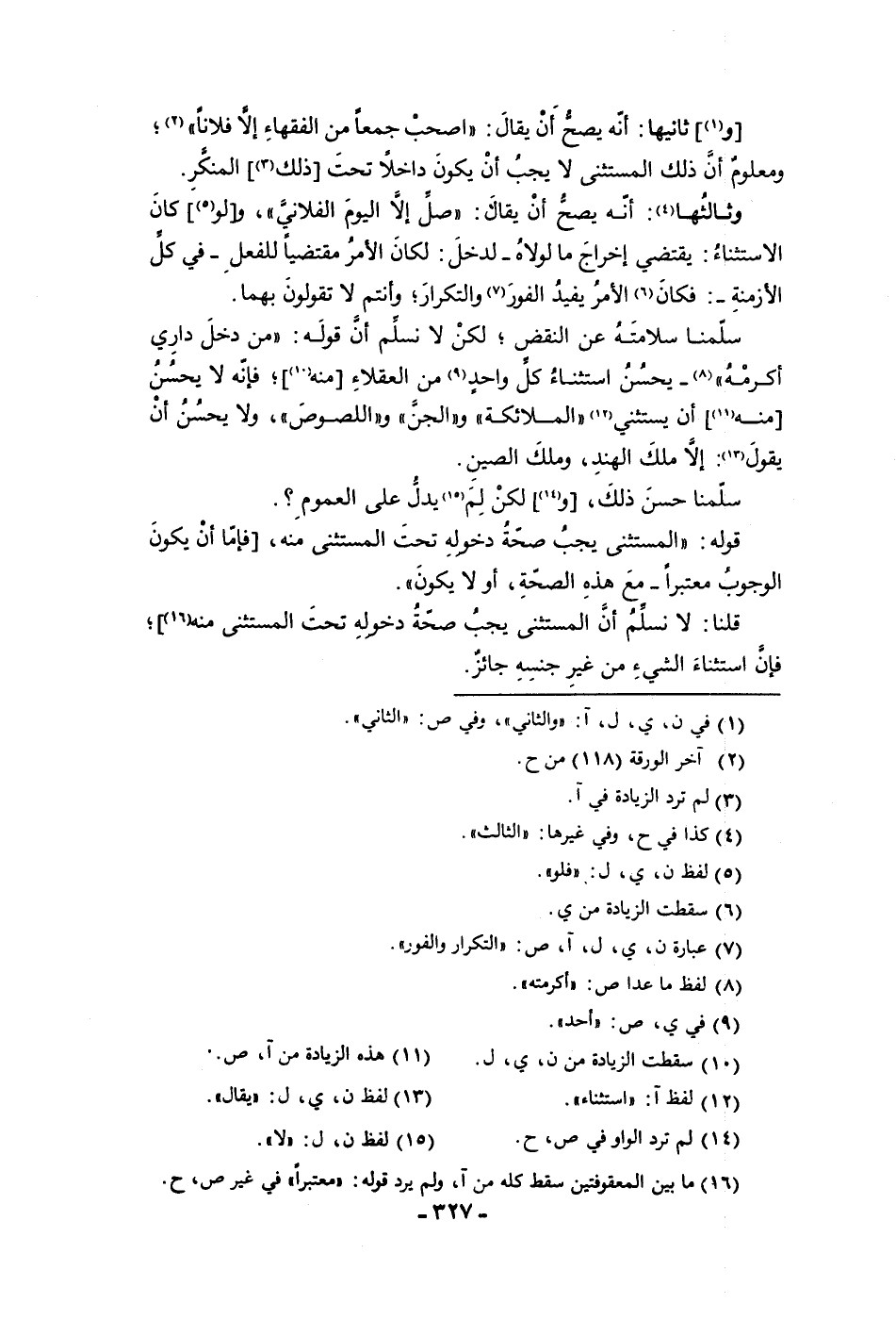 وثانيها أنه يصح أن يقال اصحب جمعا من الفقهاء إلا فلانا ومعلوم أن ذلك المستثنى لا يجب أن يكون داخلا تحت ذلك المنكر وثاليها ثم إنه يصح أن يقال صل إلا اليوم الفلاني ولو كان الاستثناء يقتضي إخراج ما لولاه لدخل لكان الأمر مقتضيا للفعل في كل الأزمنة فكان الأمر يفيد الفور والتكرار وأنتم لا تقولون بهما سلمنا سلامته عن النقض لكن لا نسلم أن قوله من دخل داري أكرمه يحسن استثناء وكل واحد من العقلاء منه فإنه لا يحسن منه أن يستثنى الملائكة والجن واللصوص ولا يحسن أن يقول إلا ملك الهند وملك الصين سلمنا حسن ذلك ولكن لم يدل على العموم قوله المستثنى يجب صحة دخوله تحت المستثنى منه فإما أن يكون الوجوب معتبرا مع هذه الصحة أو لا يكون قلنا لا نسلم أن المستثنى يجب صحة دخوله تحت المستثنى منه فإن استثناء الشئ من غير جنسه جائز