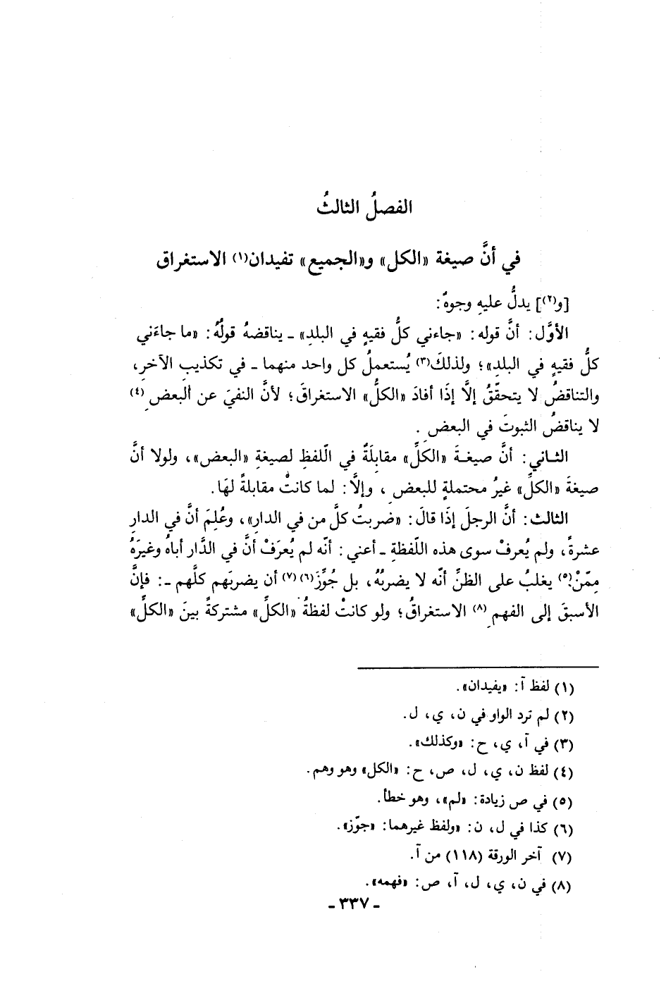 الفصل الثالث في أن صيغة الكل والجميع تفيدان الاستغراق ويدل عليه وجوه الأول أن قوله جاءني كل فقيه في البلد يناقضه قوله ما جاءني كل فقيه في البلد ولذلك يستعمل كل واحد منهما في تكذيب الآخر والتناقض لا يتحقق إلا إذا أفاد الكل الاستغراق لأن النفي عن البعض لا يناقض الثبوت في البعض الثاني أن صيغة الكل مقابلة في اللفظ لصيغة البعض ولولا أن صيغة الكل غير محتملة للبعض وإلا لما كانت مقابلة لها الثالث أن الرجل إذا قال ضربت كل من في الدار وعلم أن في الدار