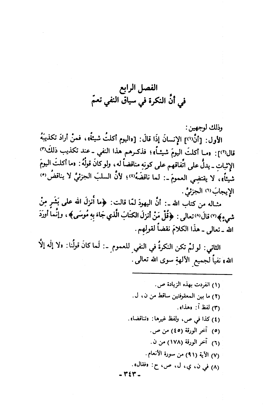 الفصل الرابع في أن النكرة في سياق النفي تعم وذلك لوجهين الأول أن الإنسان إذا قال اليوم أكلت شيئا فمن أراد تكذيبه قال ما أكلت اليوم شيئا فذكرهم هذا النفي عند تكذيب ذلك الإثبات يدل على اتفاقهم على كونه مناقضا له ولو كان قوله ما أكلت اليوم شيئا لا يقتضي العموم لما ناقضه لأن السلب الجزئي لا يناقض الإيجاب الجزئي مثاله من كتاب الله أن اليهود لما قالت ما أنزل الله على بشر من شئ قال تعالى قل من أنزل الكتاب الذي جاء به موسى وإنما أورد الله تعالى هذا الكلام نقضا لقولهم الثاني لو لم تكن النكرة في النفي للعموم لما كان قولنا لا إله إلا الله نفيا لجميع الآلهة سوى الله تعالى.