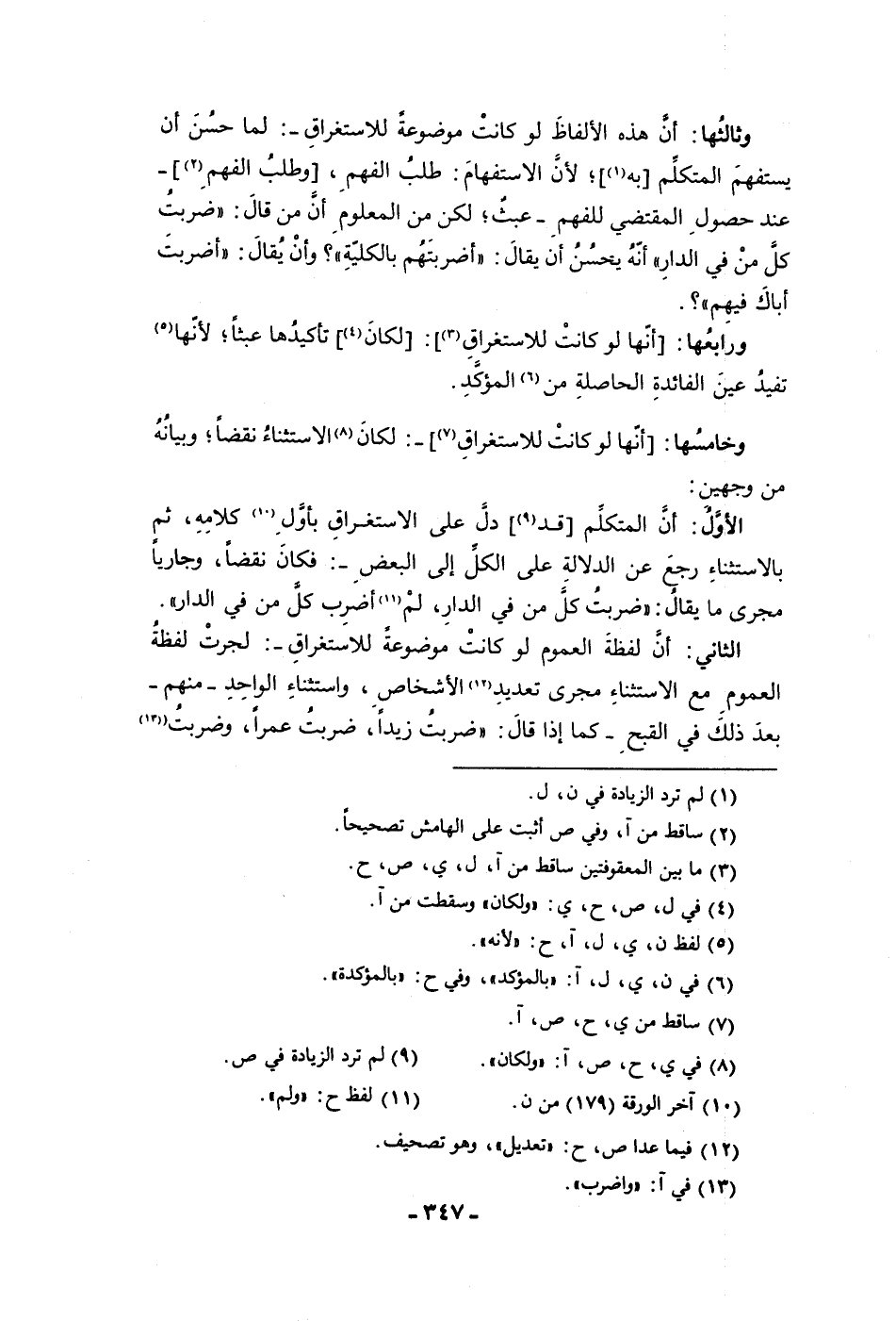 وثالثها أن هذه الألفاظ لو كانت موضوعة للاستغراق لما حسن أن يستفهم المتكلم به لأن الاستفهام طلب الفهم وطلب الفهم عند حصول المقتضى للفهم عبث لكن من المعلوم أن من قال ضربت كل من في الدار أنه يحسن أن يقال اضربتهم قوله بالكلية وأن يقال أضربت أباك فيهم ورابعها أنها لو كانت للاستغراق لكان تأكيدها عبثا لأنها تفيد عين الفائدة الحاصلة من المؤكد وخامسها أنها لو كانت للاستغراق لكان الاستثناء نقضا وبيانه من وجهين الأول أن المتكلم قد دل على الاستغراق بأول كلامه ثم بالاستثناء رجع عن الدلالة على الكل إلى البعض فكان نقضا وجاريا