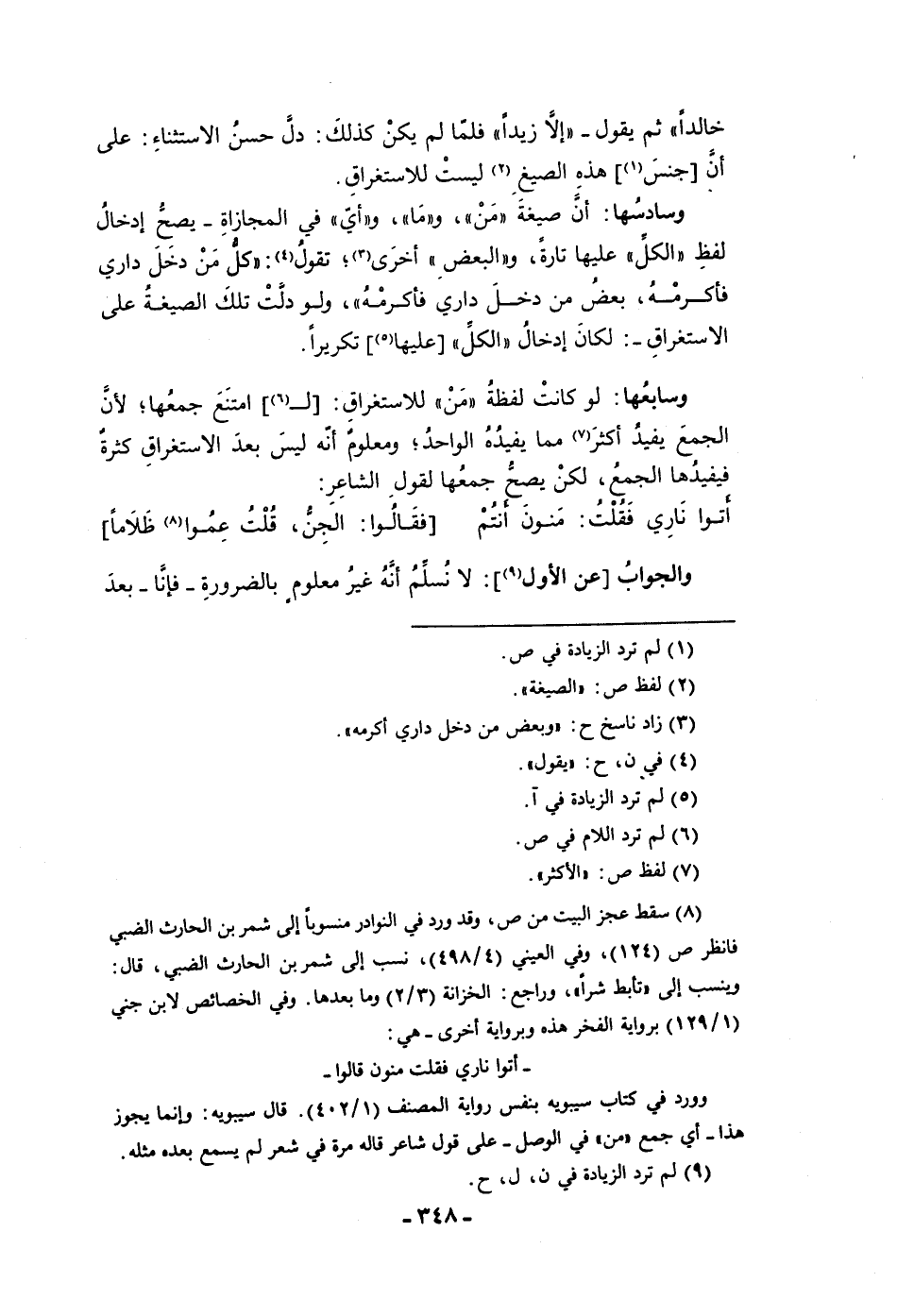 خالدا ثم يقول إلا زيدا فلما لم يكن كذلك دل حسن الاستثناء على أن جنس هذه الصيغ ليست للاستغراق وسادسها أن صيغة من وما وأي في المجازاة يصح إدخال لفظ الكل عليها تارة والبعض أخرى تقول كل من دخل داري فأكرمه بعض من دخل داري فأكرمه ولو دلت تلك الصيغة على الاستغراق لكان إدخال الكل عليها تكريرا وسابعها لو كانت لفظة من للاستغراق لامتنع جمعها لأن الجمع يفيد أكثر مما يفيده الواحد ومعلوم أنه ليس بعد الاستغراق كثرة فيفيدها الجمع لكن يصح جمعها لقول الشاعر أتوا ناري فقلت منون أنتم فقالوا الجن قلت عموا ظلاما والجواب عن الأول لا نسلم أنه غير معلوم بالضرورة فإنا بعد