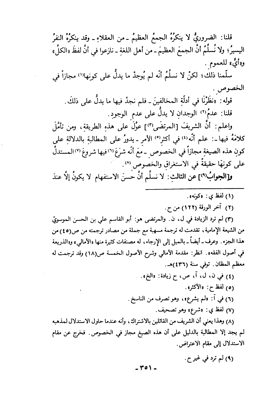 قلنا الضروري لا ينكره الجمع العظيم من العقلاء وقد ينكره النفر اليسير ولا نسلم أن الجمع العظيم من أهل اللغة نازعوا في أن لفظ الكل وأي للعموم سلمنا ذلك لكن لا نسلم أنه لو يوجد ما يدل على كونها مجازا في الخصوص قوله نظرنا في أدلة المخالفين فلم نجد فيها ما يدل على ذلك قلنا عدم الوجدان لا يدل على عدم الوجود واعلم أن الشريف المرتضى عول على هذه الطريقة ومن تأمل كلامه فيها علم أنه في أكثر الأمر يدور على المطالبة بالدلالة على كون هذه الصيغة مجازا في الخصوص مع أنه شرع فيها شروع المستدل على كونها حقيقة في الاستغراق والخصوص والجواب عن الثالث لا نسلم أن حسن الاستفهام لا يكون إلا عند