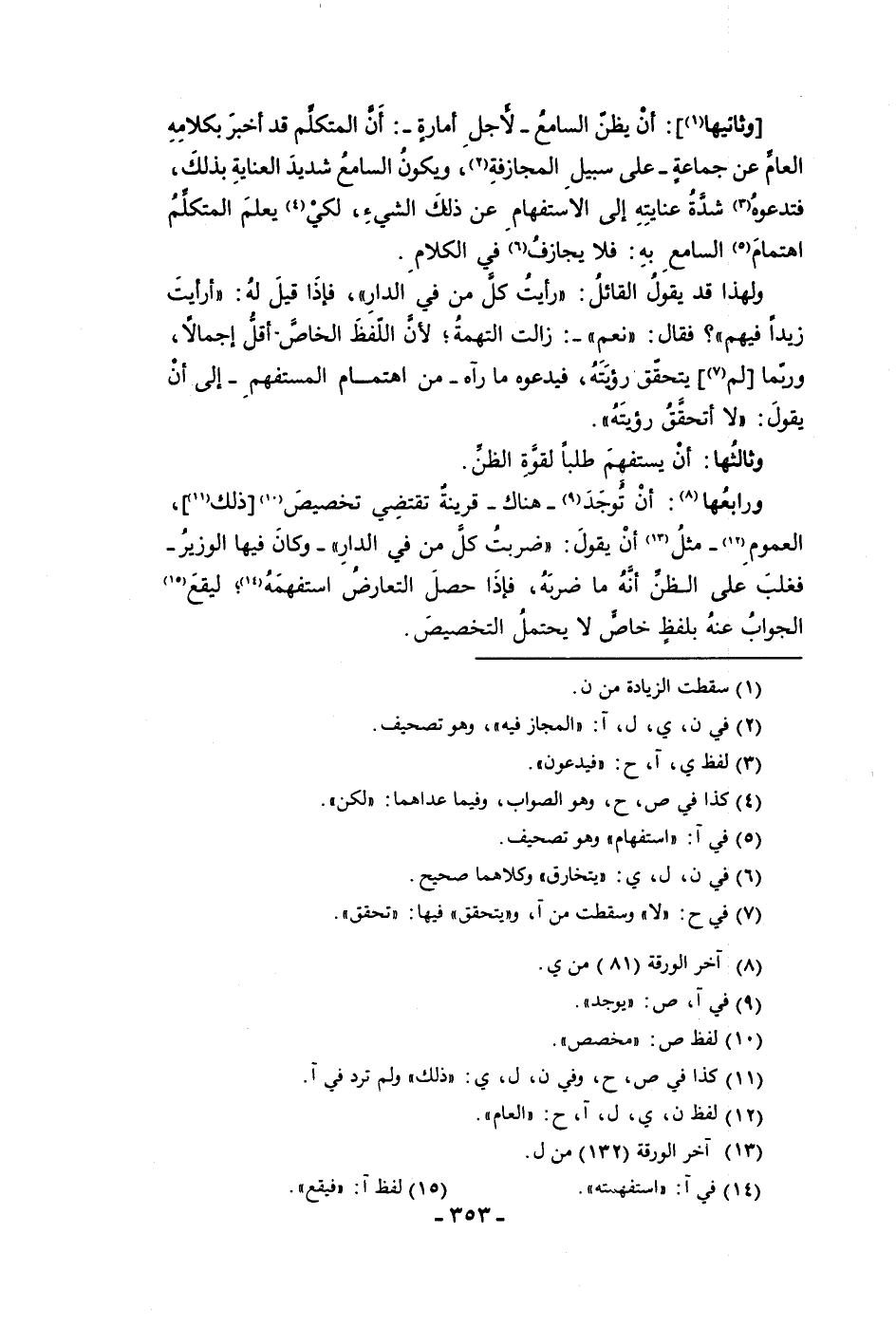 وثانيها أن يظن السامع لأجل أمارة أن المتكلم قد أخبر بكلامه العام عن جماعة على سبيل المجازفة ويكون السامع شديد العناية بذلك فتدعوه شدة عنايته إلى الاستفهام عن ذلك الشئ لكي يعلم المتكلم اهتمام السامع به فلا يجازف في الكلام ولهذا قد يقول القائل رأيت كل من في الدار فإذا قيل له أرأيت زيدا فيهم فقال نعم زالت التهمة لأن اللفظ الخاص أقل إجمالا وربما لم يتحقق رؤيته فيدعوه ما رآه من اهتمام المستفهم إلى أن يقول لا أتحقق رؤيته