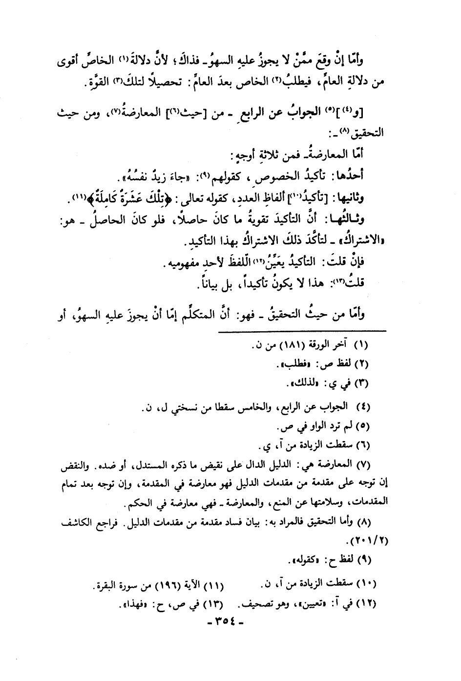 وأما إن وقع ممن لا يجوز عليه السهو فذاك لأن دلالة الخاص أقوى من دلالة العام فيطلب الخاص بعد العام تحصيلا لتلك القوة والجواب عن الرابع من حيث المعارضة ومن حيث التحقيق أما المعارضة فمن ثلاثة أوجه أحدها تأكيد الخصوص كقولهم جاء زيد نفسه وثانيها تأكيد ألفاظ العدد كقوله تعالى تلك عشرة كاملة وثالثها إن التأكيد تقوية ما كان حاصلا فلو كان الحاصل هو الاشتراك لتأكد ذلك الاشتراك بهذا التأكيد فإن قلت التأكيد يعين اللفظ لأحد مفهوميه قلت هذا لا يكون تأكيدا بل بيانا وأما من حيث التحقيق فهو أن المتكلم إما أن يجوز عليه السهو أو