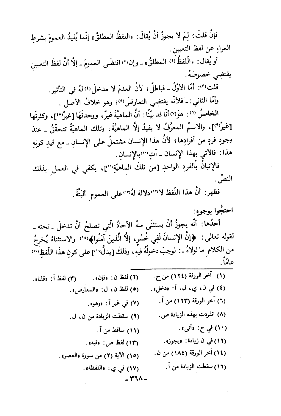 وأما الثاني فلأنه يقتضي التعارض وهو خلاف الأصل الخامس هو أنا قد بينا أن الماهية غير ووحدتها غير وكثرتها غير والاسم المعرف لا يفيد إلا الماهية وتلك الماهية تتحقق عند وجود فرد من أفرادها لأن هذا الإنسان مشتمل على الإنسان مع قيد كونه هذا فالآتي بهذا الإنسان آت بالإنسان فالإتيان بالفرد الواحد من تلك الماهية يكفي في العمل بذلك النص فظهر أن هذا اللفظ لا دلالة له على العموم البته احتجوا بوجوه أحدها أنه يجوز أن يستثنى منه الآحاد التي تصلح أن تدخل تحته لقوله تعالى إن الإنسان لفي خسر إلا الذين آمنوا والاستثناء يخرج من الكلام ما لولاه لوجب دخوله فيه وذلك يدل على كون هذا اللفط