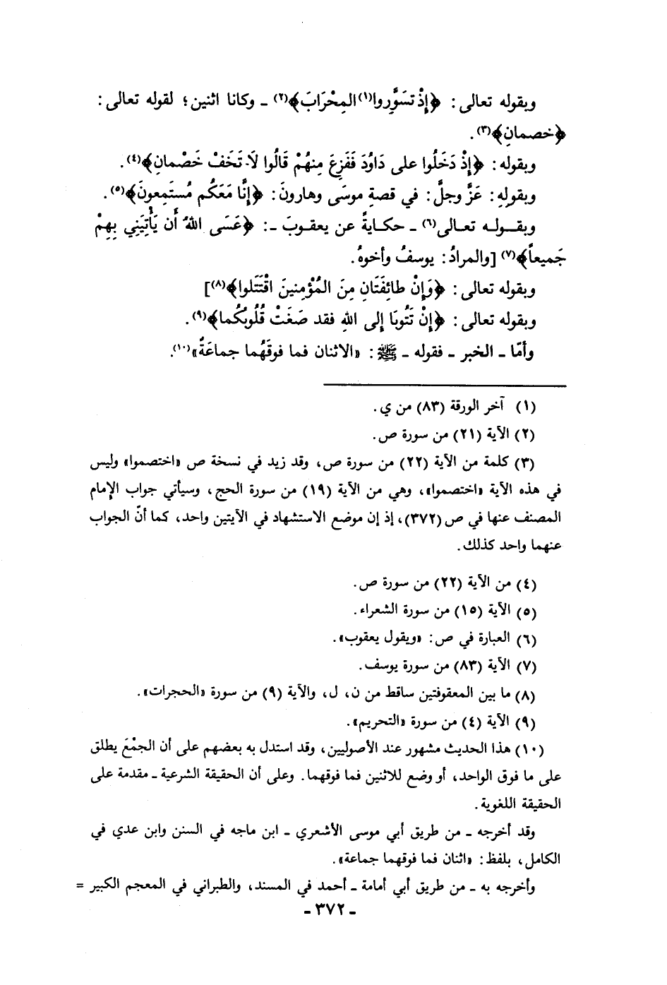وبقوله تعالى إذ تسوروا المحراب وكانا اثنين لقوله تعالى خصمان وبقوله إذ دخلوا على داوود ففزع منهم قالوا لا تخف خصمان وبقوله عز وجل في قصة موسى وهارون إنا معكم مستمعون وبقوله تعالى حكاية عن يعقوب عسى الله أن يأتيني بهم جميعا والمراد يوسف وأخوه وبقوله تعالى وإن طائفتان من المؤمنين اقتتلوا وبقوله تعالى إن تتوبا إلى الله فقد صغت قلوبكما وأما الخبر فقوله ص الاثنان فما فوقهما جماعة