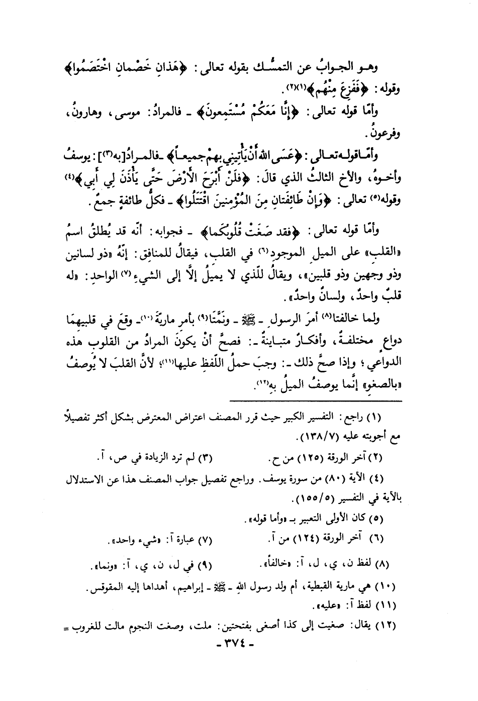 وهو الجواب عن التمسك بقوله تعالى هذان خصمان اختصموا وقوله ففزع منهم وأما قوله تعالى إنا معكم مستمعون فالمراد موسى وهارون وفرعون وأما قوله تعالى عسى الله أن يأتيني بهم جميعا فالمراد به يوسف وأخوه والأخ الثالث الذي قال فلن أبرح الآرض حتى يأذن لي أبي وقوله تعالى وإن طائفتان من المؤمنين اقتتلوا فكل طائفة جمع وأما قوله تعالى فقد صغت قلوبكما فجوابه أنه قد يطلق اسم القلب على الميل الموجود في القلب فيقال للمنافق إنه ذو لسانين وذو وجهين وذو قلبين ويقال للذي لا يميل إلا إلى الشئ الواحد له قلب واحد ولسان واحد ولما خالفتا أمر الرسول ص ونمتا أو بأمر مارية وقع في قلبيهما دواع مختلفة وأفكار متباينة فصح أن يكون المراد من القلوب هده الدواعي وإذا صح ذلك وجب حمل اللفظ عليها لأن القلب لا يوصف