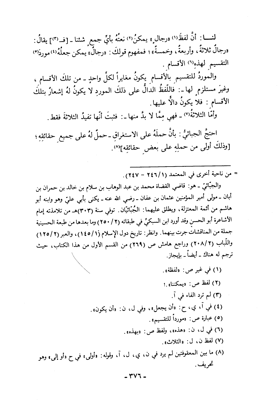 لنا أن لفظ رجال يمكن نعته بأي جمع شئنا فيقال رجال ثلاثة وأربعة وخمسة فمفهوم قولك رجال يمكن جعله مورد التقسيم لهذه الأقسام والمورد للتقسيم بالأقسام يكون مغايرا لكل واحد من تلك الأقسام وغير مستلزم لها فاللفظ الدال على ذلك المورد لا يكون له إشعار بتلك الأقسام فلا يكون دالا عليها وأما الثلاثة فهي مما لابد منها فثبت أنها تفيد الثلاثة فقظ احتج الجبائي بأن حمله على الاستغراق حمل له على جميع حقائقه وذلك أولى من حمله على بعض حقائقه