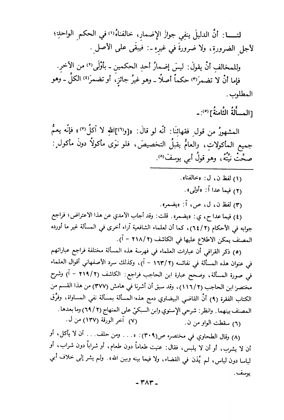 لنا أن الدليل ينفي جواز الإضمار خالفناه في الحكم الواحد لأجل الضرورة ولا ضرورة في غيره فيقى على الأصل وللمخالف أن يقول ليس إضمار أحد الحكمين بأولى من الآخر فإما أن لا تضمر حكما أصلا وهو غير جائز أو تضمر الكل وهو المطلوب المسألة الثامنة المشهور من قول فقهائنا أنه لو قال والله لا آكل فإنه يعم جميع المأكولات والعام يقبل التخصيص فلو نوى مأكولا دون مأكول صحت نيته وهو قول أبي يوسف
